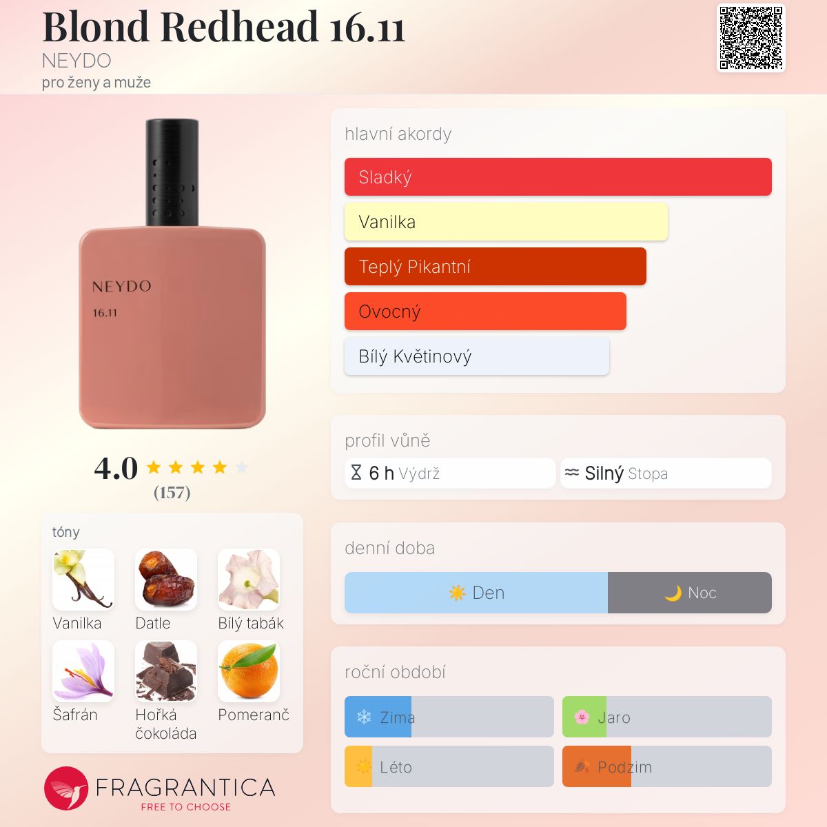 Blond Redhead 16.11 podle NEYDO je Orientální Vanilla vůně pro ženy a muže. Toto je nová vůně. Blond Redhead 16.11 byl/a uveden/a v roce 2024. "Nosem" za touto vůní je Bertrand Duchaufour. Vrchní tóny jsou Šafrán, Pomeranč a Limetka; střední tóny jsouDatle, Fíkový nektar, Frézie a Růže ; základní tóny jsou Vanilka, Bílý tabák, Čokoláda, Myrha a Naplavené dříví.