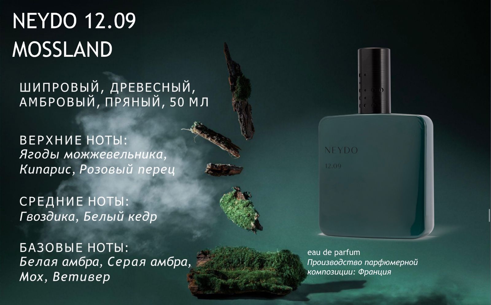Mossland 12.09 podle NEYDO je Woody Chypre vůně pro ženy a muže. Toto je nová vůně. Mossland 12.09 byl/a uveden/a v roce 2024. "Nosem" za touto vůní je Bertrand Duchaufour. Vrchní tóny jsou Jalovcové bobulky, Cypřiš a Růžový pepř; střední tóny jsouExtrakt z bílého cedru a Hřebíček ; základní tóny jsou Dubový mech, Bílý jantar (ambra), Vetiver a Ambra.