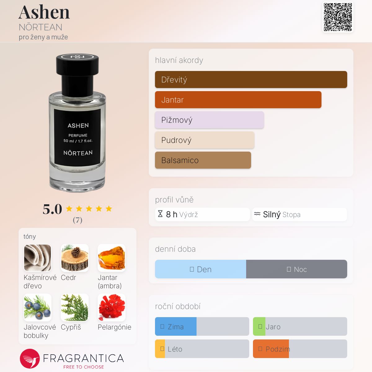 Ashen podle NŌRTEAN je vůně pro ženy a muže. Ashen byl/a uveden/a v roce 2023. "Nosem" za touto vůní je Arturs Petersons. Vrchní tóny jsou Jalovcové bobulky a Cypřiš; střední tóny jsouPelargónie a Hřebíček ; základní tóny jsou Kašmírové dřevo, Cedr a Jantar (ambra).