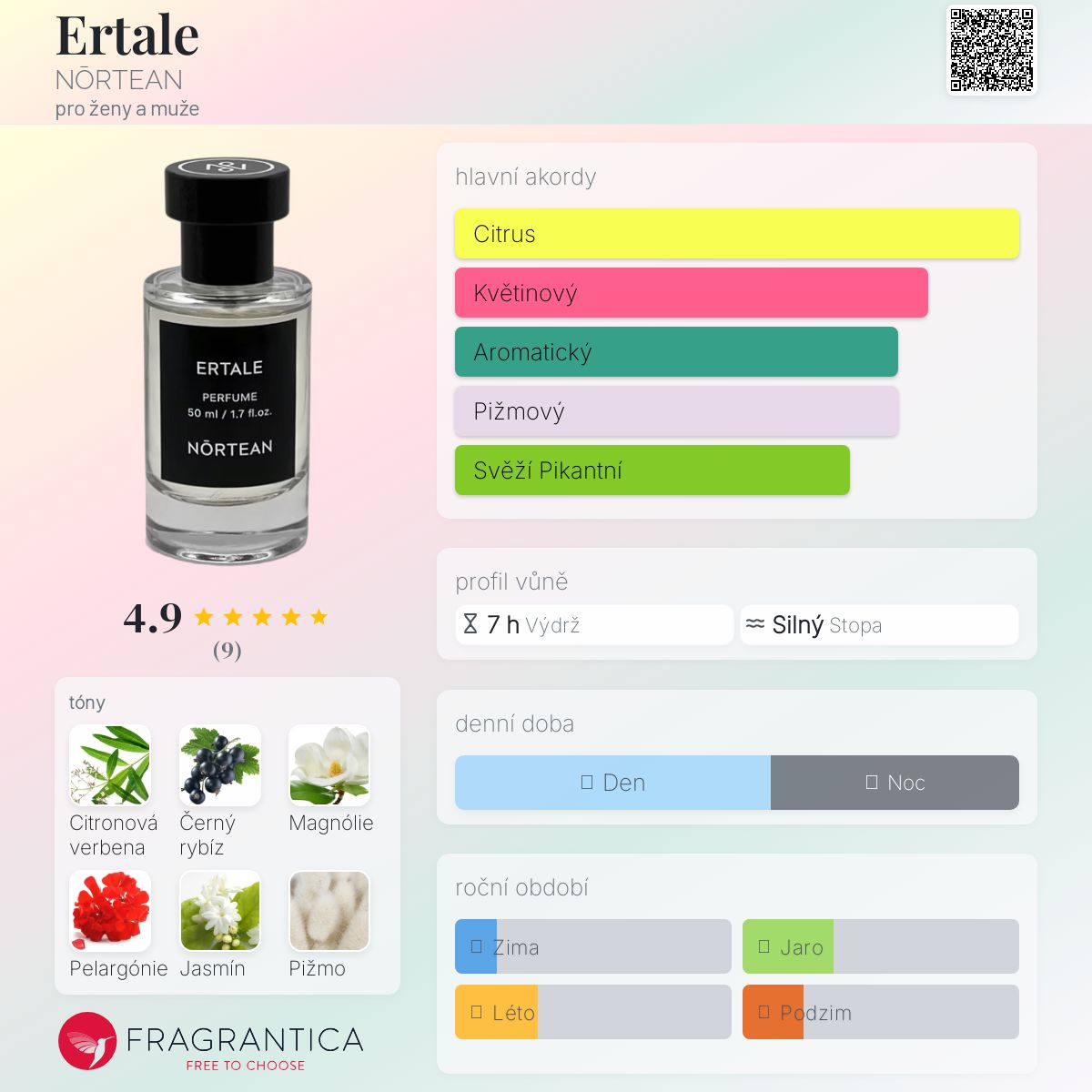 Ertale podle NŌRTEAN je vůně pro ženy a muže. Ertale byl/a uveden/a v roce 2023. "Nosem" za touto vůní je Arturs Petersons. Vrchní tóny jsou Černý rybíz a Magnólie; střední tóny jsouSporýš, Pelargónie a Jasmín ; základní tóny jsou Bílé pižmo a Ambrette (přírodní pižmo).