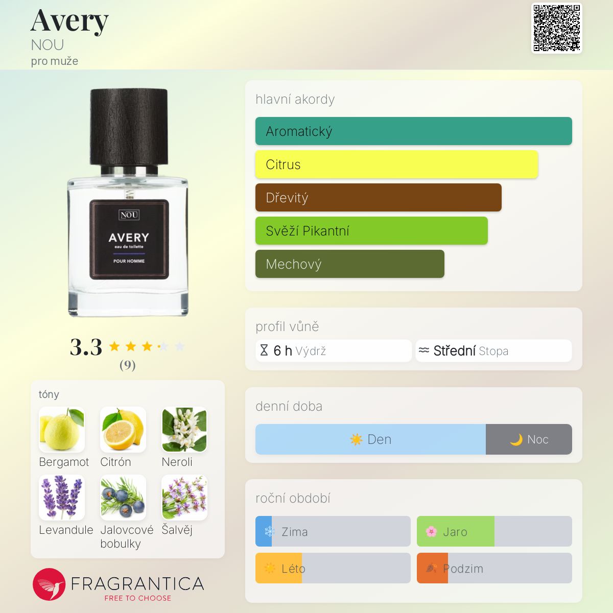 Avery podle NOU je Citrus Aromatic vůně pro muže. Avery byl/a uveden/a v roce 2017. Vrchní tóny jsou Bergamot, Citrón a Neroli; střední tóny jsouLevandule, Jalovcové bobulky a Šalvěj ; základní tóny jsou Mech, Santalové dřevo a Jantar (ambra).