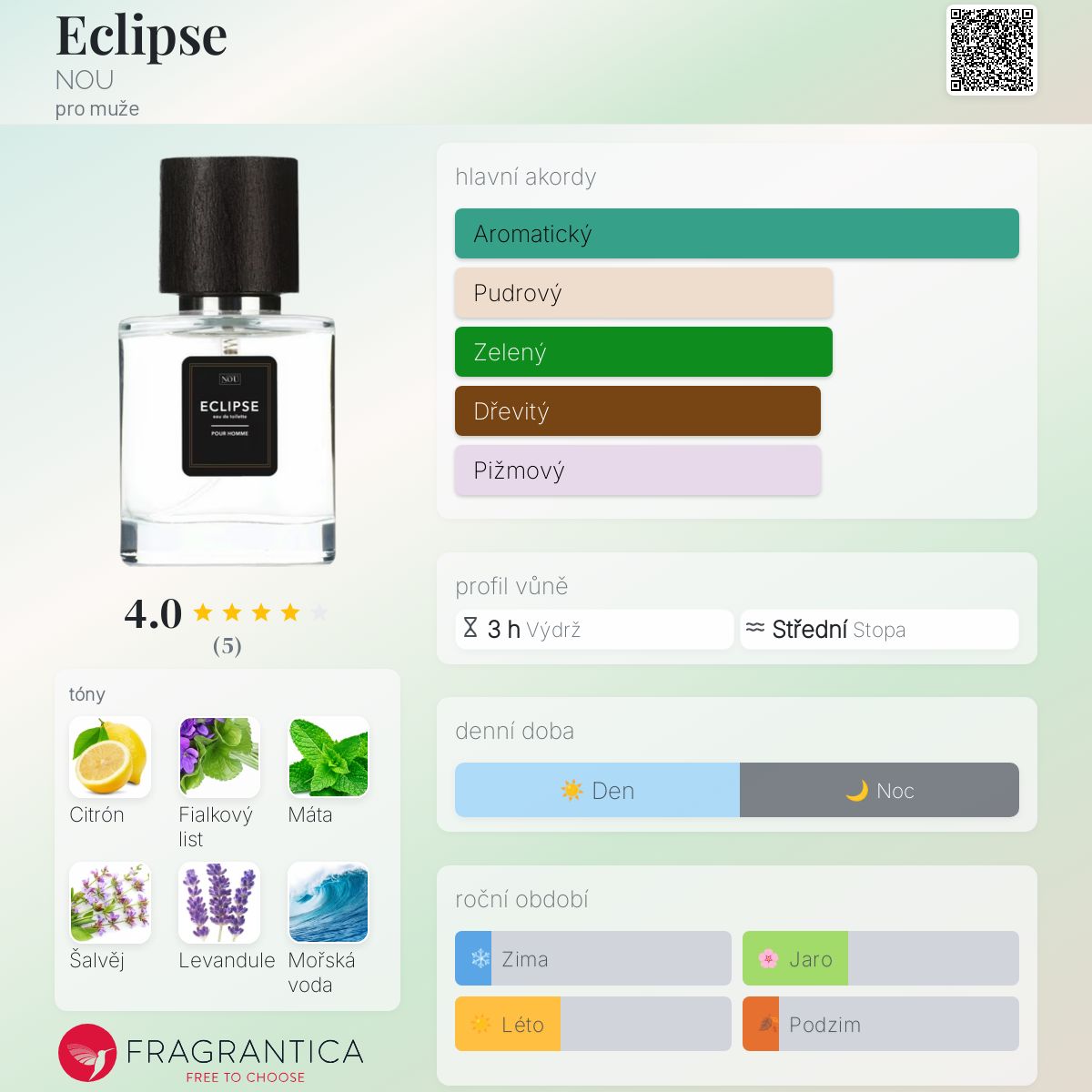 Eclipse podle NOU je Aromatic Aquatic vůně pro muže. Eclipse byl/a uveden/a v roce 2019. Vrchní tóny jsou Citrón a Fialkový list; střední tóny jsouMáta, Šalvěj, Levandule a Mořské tóny ; základní tóny jsou Cedr, Kosatec a Pižmo.