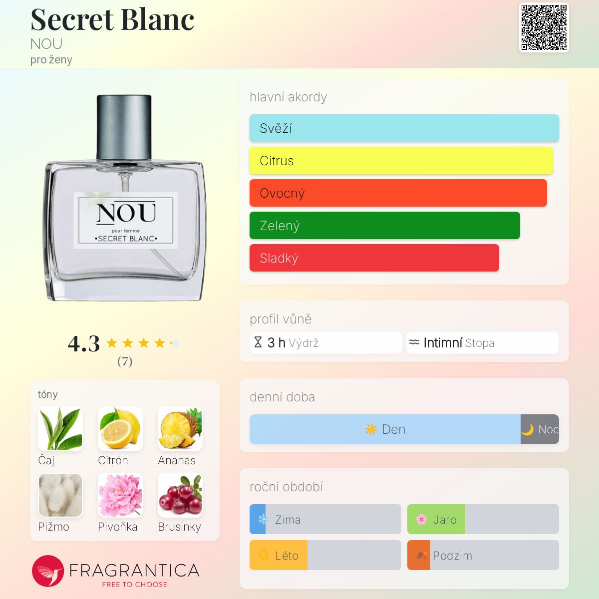 Secret Blanc podle NOU je Floral Fruity vůně pro ženy. Secret Blanc byl/a uveden/a v roce 2017. Vrchní tóny jsou Bílý čaj, Citrón, Ananas a Rebarbora; střední tóny jsouPivoňka, Brusinky a Jasmín ; základní tóny jsou Pižmo, Fazole tonka a Pačuli.
