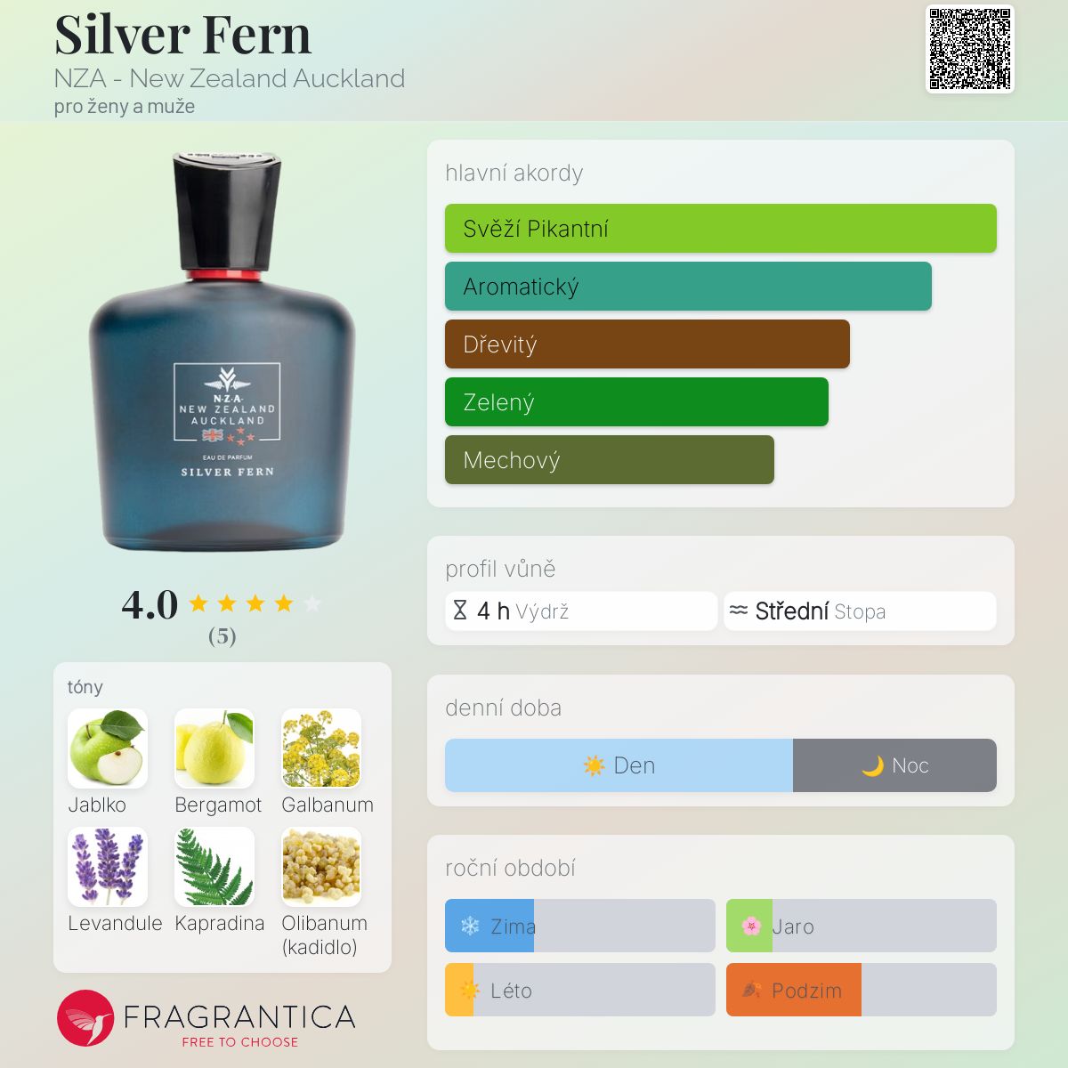 Silver Fern podle NZA - New Zealand Auckland je vůně pro ženy a muže. Silver Fern byl/a uveden/a v roce 2021. Silver Fern byl/a vytvořen/a Olivier Cresp a Sébastien Cresp. Vrchní tóny jsou Jablko, Bergamot a Galbanum; střední tóny jsouLevandule, Kapradina, Olibanum a Pepř ; základní tóny jsou Cedr, Kůže a Dubový mech.