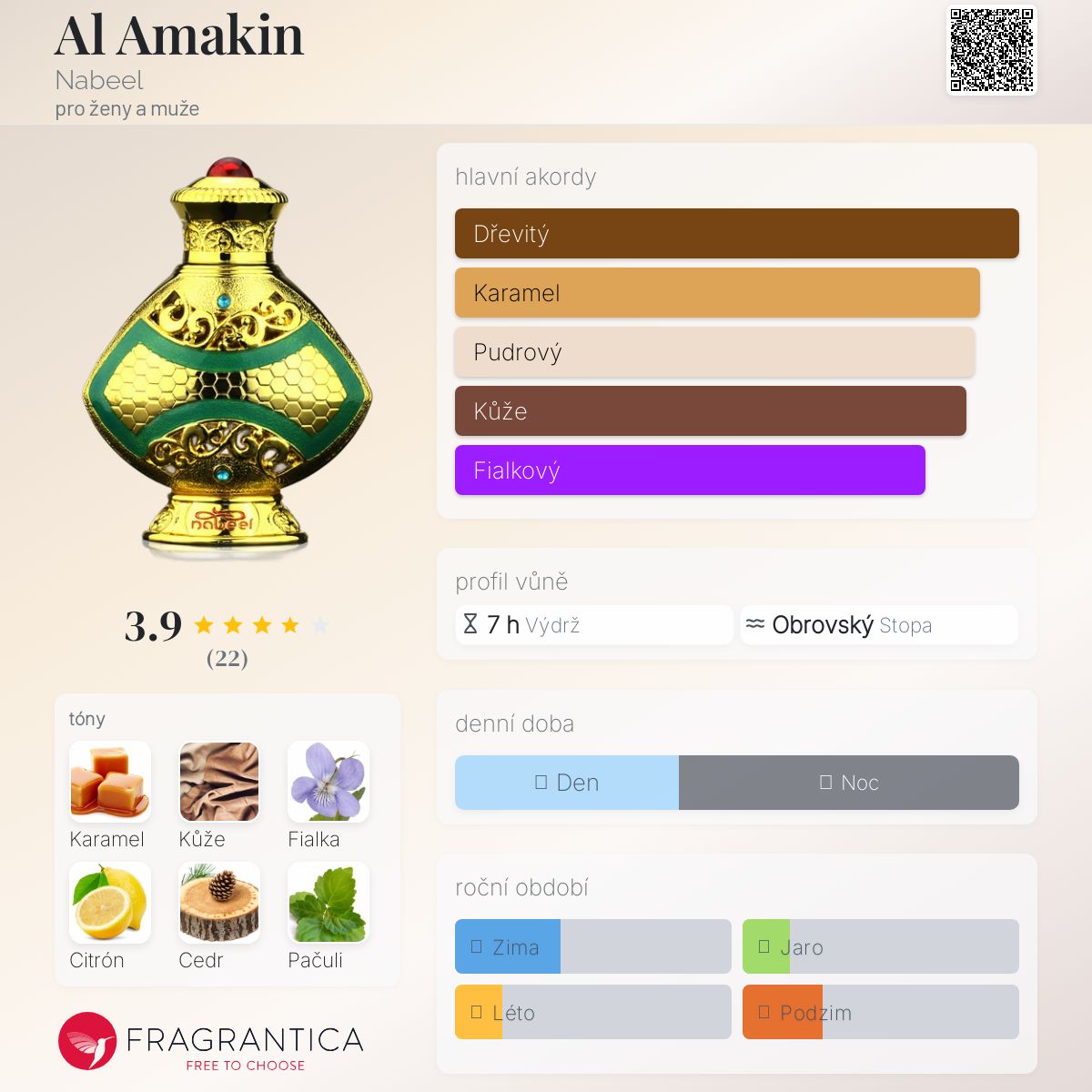 Al Amakin podle Nabeel je vůně pro ženy a muže. Vrchní tón je Citrón ; střední tóny jsouKůže, Fialka a Pačuli ; základní tóny jsou Karamel, Cedr, Pižmo a Fazole tonka.