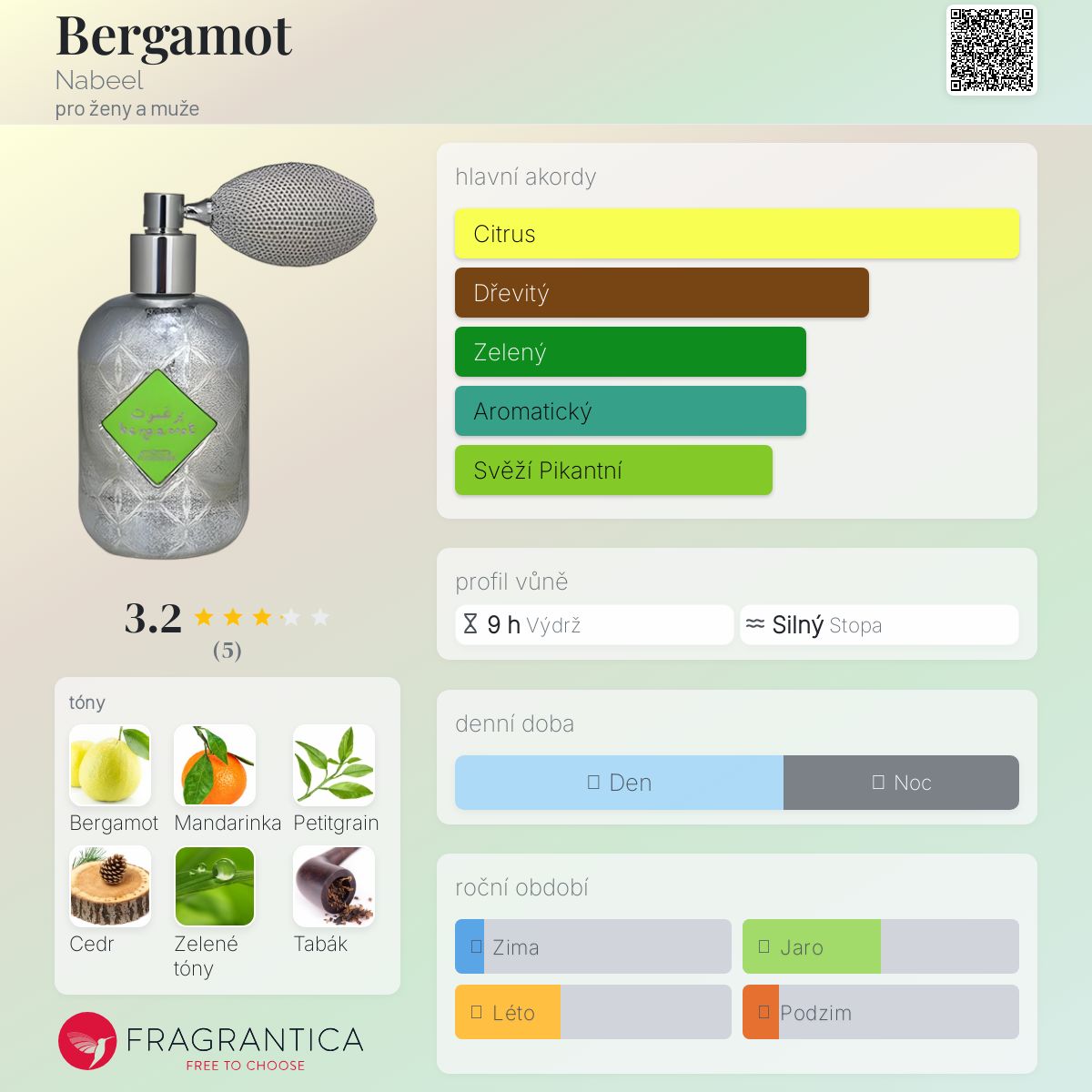 Bergamot podle Nabeel je Woody Aromatic vůně pro ženy a muže. Bergamot byl/a uveden/a v roce 2016. Vrchní tóny jsou Bergamot, Mandarinka, Petitgrain a Zelené tóny; střední tóny jsouCedr, Tabák a Pačuli ; základní tóny jsou Jantar (ambra) a Vetiver.