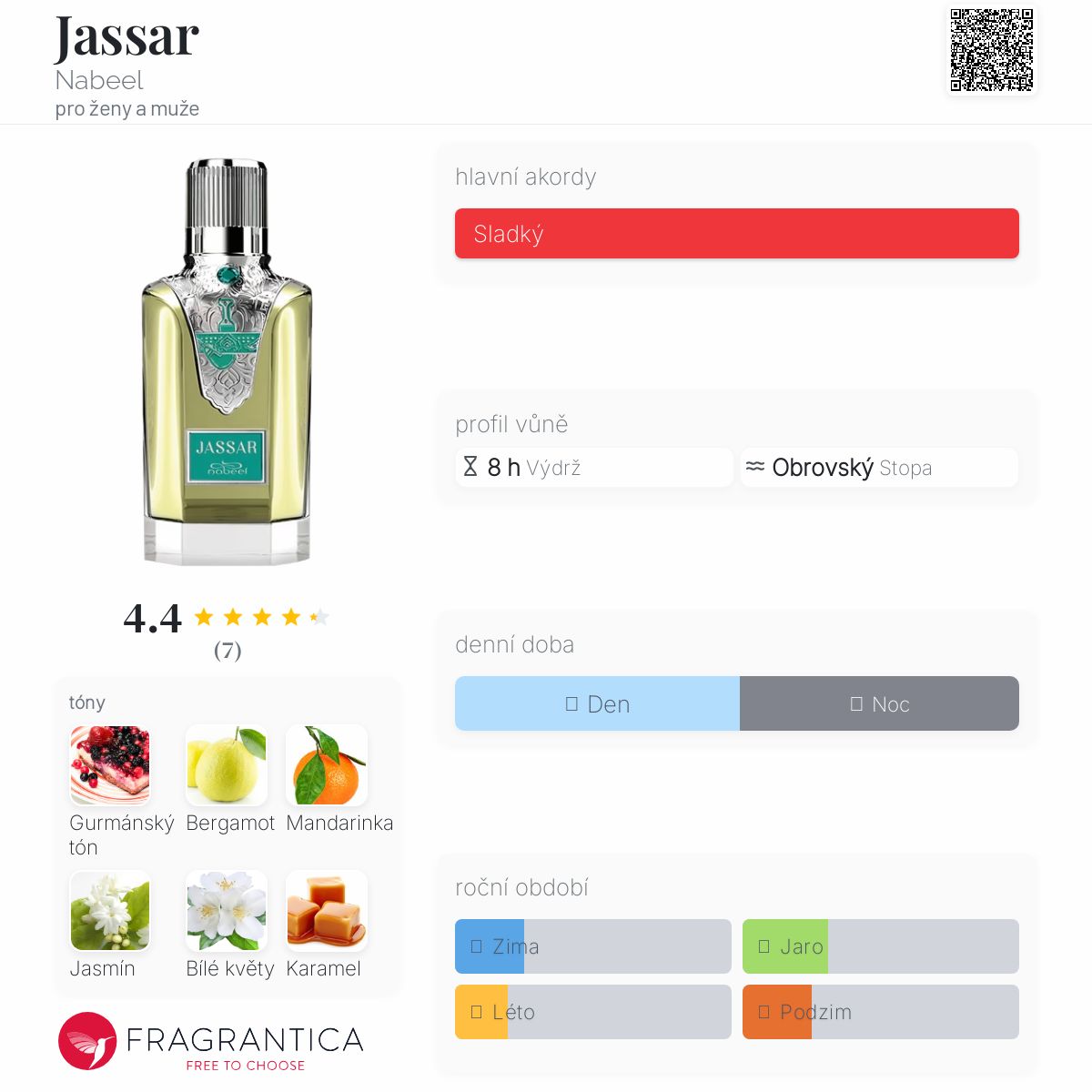 Jassar podle Nabeel je Orientální Floral vůně pro ženy a muže. Toto je nová vůně. Jassar byl/a uveden/a v roce 2024. Vrchní tóny jsou Bergamot, Mandarinka, Jasmín a Bílé květy; střední tóny jsouGurmánský tón, Karamel a Růže ; základní tóny jsou Santalové dřevo, Vanilka, Jantar (ambra) a Pižmo.
