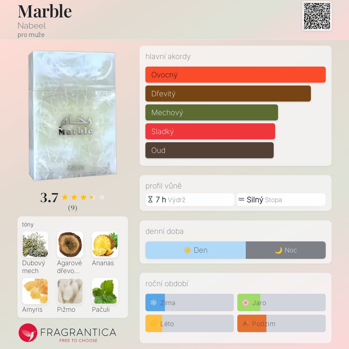 Marble podle Nabeel je vůně pro muže. Marble byl/a uveden/a v roce 2018. Vrchní tóny jsou Ananas, Černý rybíz, Jablko, Růže, Bergamot a Citrón; střední tóny jsouAgarové dřevo (oud), Amyris, Pačuli, Jasmín, Bříza, Koriandr a Jalovec ; základní tóny jsou Mech, Pižmo, Vanilka, Kůže, Červené bobule a Jantar (ambra).