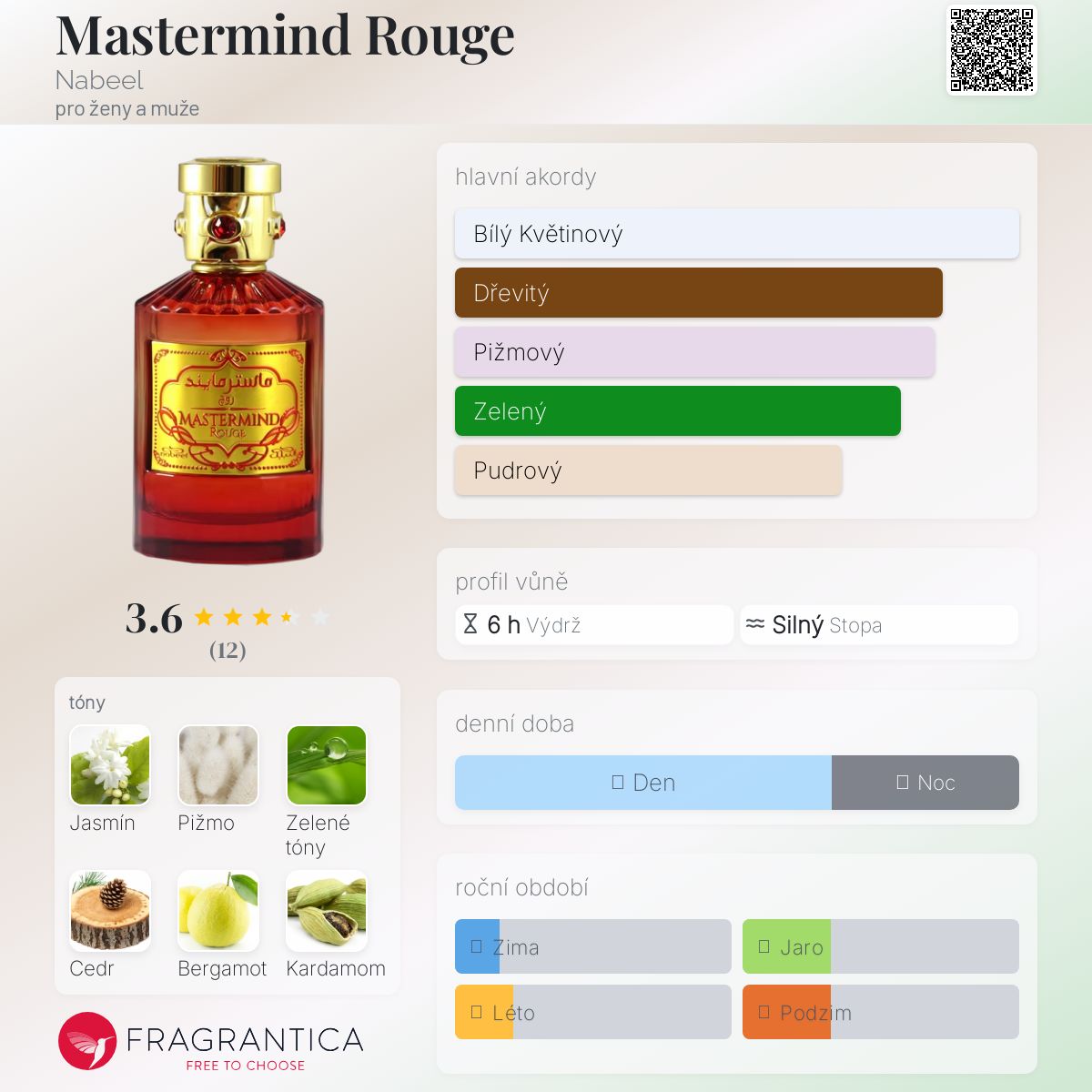 Mastermind Rouge podle Nabeel je Woody Floral Musk vůně pro ženy a muže. Mastermind Rouge byl/a uveden/a v roce 2022. Vrchní tóny jsou Zelené tóny, Bergamot, Kardamom a Kůže; střední tóny jsouJasmín, Cedr, Ylang-Ylang a Pačuli ; základní tóny jsou Pižmo, Dřevité tóny a Sladké tóny.