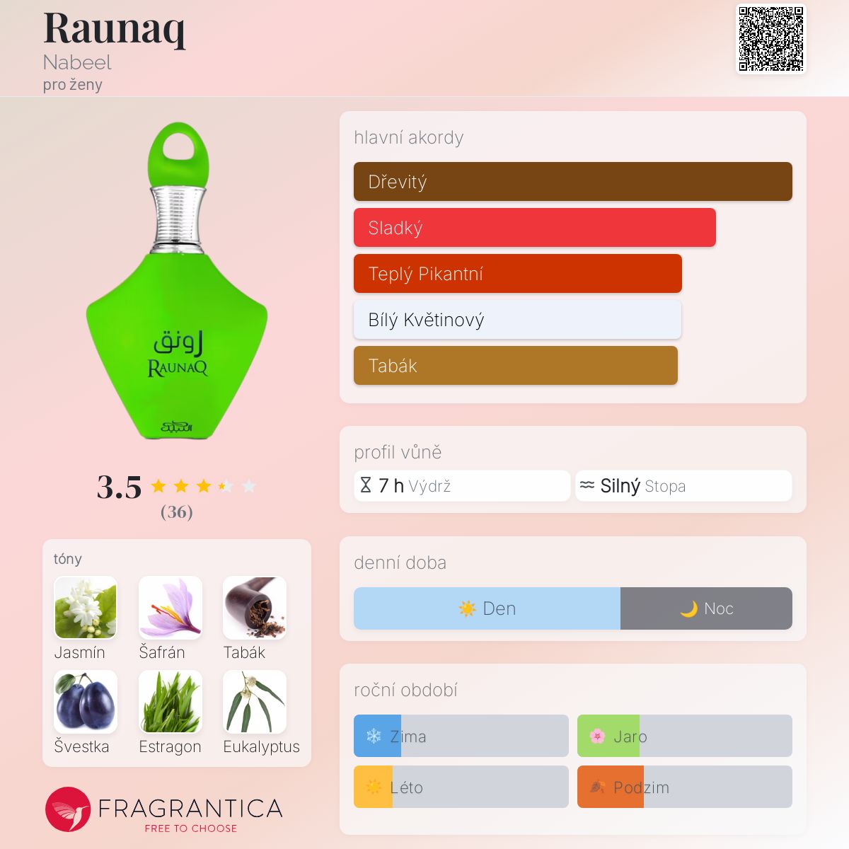 Raunaq podle Nabeel je Woody Floral Musk vůně pro ženy. Raunaq byl/a uveden/a v roce 2022. Vrchní tóny jsou Šafrán, Tabák, Švestka, Růže, Pomeranč a Jahoda; střední tóny jsouJasmín, Estragon, Eukalyptus, Cypriolový olej, Ylang-Ylang, Cedr, Magnólie a Konvalinka ; základní tóny jsou Santalové dřevo, Jantar (ambra), Dubový mech, Pačuli, Cukr, Vanilka, Pižmo, Kumarin, Cedr, Guajakové dřevo a Bílé pižmo.