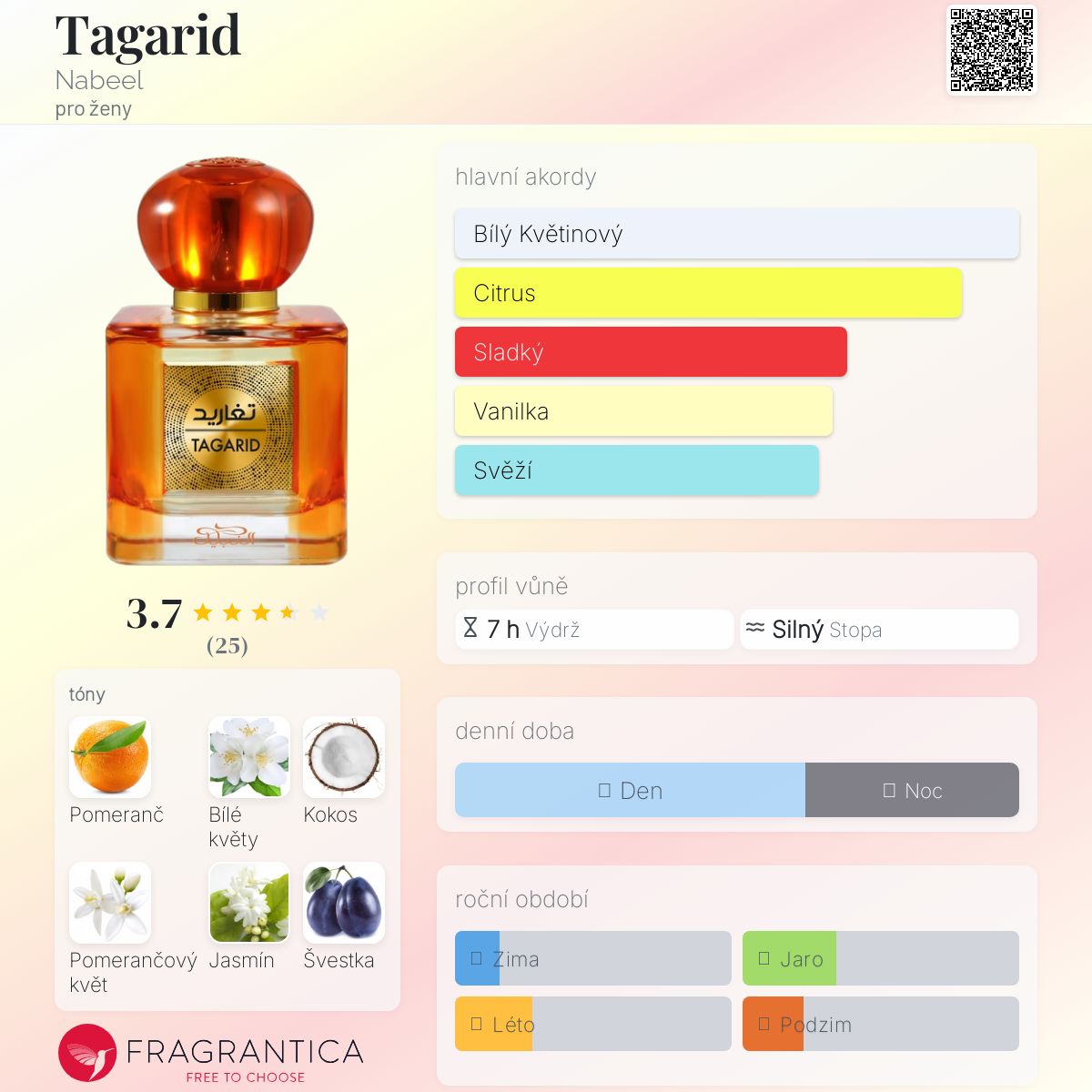 Tagarid podle Nabeel je Floral Fruity vůně pro ženy. Tagarid byl/a uveden/a v roce 2022. Vrchní tóny jsou Pomeranč, Pomerančový květ, Švestka, Aldehydy, Neroli a Bergamot; střední tóny jsouBílé květy, Jasmín, Konvalinka, Pačuli, Santalové dřevo a Šafrán ; základní tóny jsou Kokos, Citrusy, Vanilka, Fazole tonka, Benzoin a Pryskyřice.