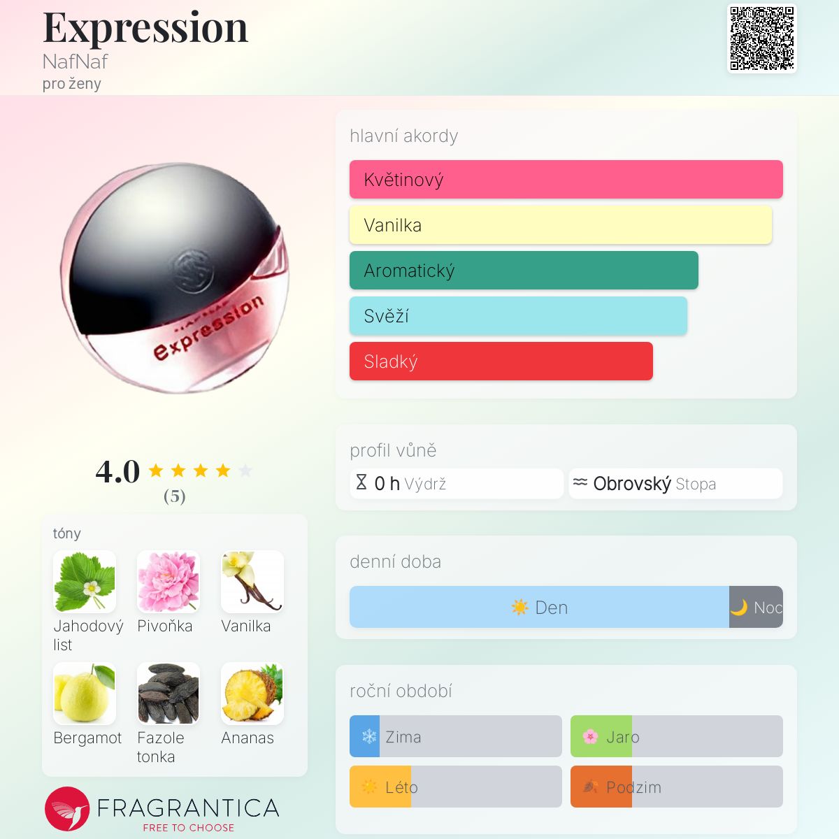 Expression podle NafNaf je Orientální Floral vůně pro ženy. Expression byl/a uveden/a v roce 2001. Expression byl/a vytvořen/a Jean-Pierre Bethouart a Annick Menardo. Vrchní tóny jsou Jahodový list, Bergamot a Ananas; střední tóny jsouPivoňka, Frézie a Fialka ; základní tóny jsou Vanilka, Fazole tonka, Vetiver a Pižmo.