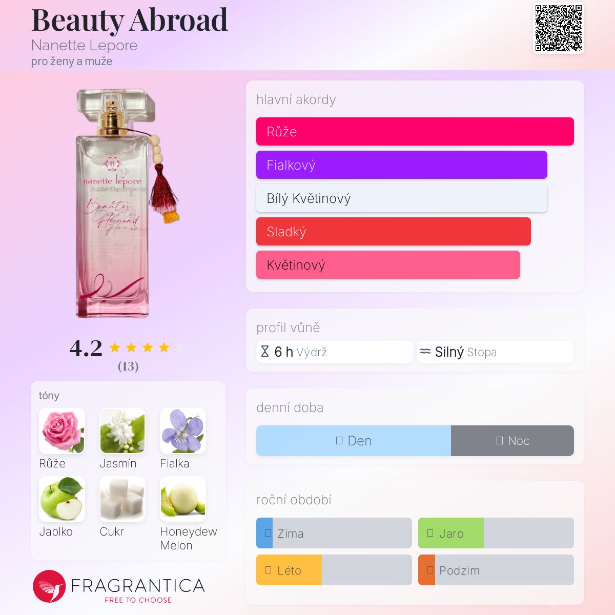Beauty Abroad podle Nanette Lepore je vůně pro ženy a muže. Beauty Abroad byl/a uveden/a v roce 2022. Vrchní tóny jsou Honeydew Melon a Okurka; střední tóny jsouRůžová růže, Fialka, Jablko a Jasmín ; základní tón je Cukr.