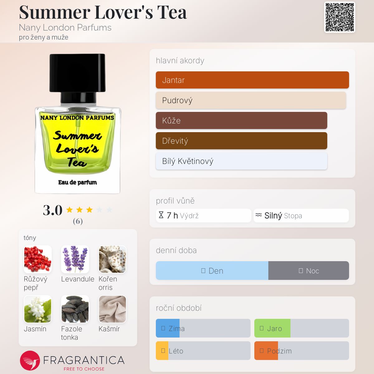 Summer Lover's Tea podle Nany London Parfums je vůně pro ženy a muže. Summer Lover's Tea byl/a uveden/a v roce 2023. Vrchní tóny jsou Růžový pepř, Levandule, Zelený čaj, Bergamot, Šalvěj a Máta; střední tóny jsouKořen orris, Jasmín, Vonokvětka, Černý čaj, Vanilka a Mandle ; základní tóny jsou Fazole tonka, Kašmír, Kůže, Ambra, Jantar (ambra) a Maté.
