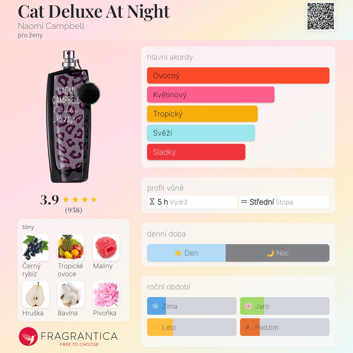 Cat Deluxe At Night podle Naomi Campbell je Floral Fruity vůně pro ženy. Cat Deluxe At Night byl/a uveden/a v roce 2007. Vrchní tóny jsou Černý rybíz, Tropické ovoce, Hruška a Pitaya; střední tóny jsouPivoňka, Brambořík a Květinové tóny ; základní tóny jsou Maliny, Bavlna, Jantar (ambra) a Dřevité tóny.