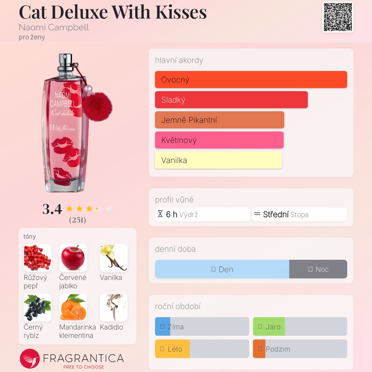 Cat Deluxe With Kisses podle Naomi Campbell je Orientální Floral vůně pro ženy. Cat Deluxe With Kisses byl/a uveden/a v roce 2009. Vrchní tóny jsou Růžový pepř, Červené jablko, Černý rybíz, Mandarinka klementina, Kardamom, Maliny, Bergamot a Červený rybíz; střední tóny jsouRůže, Pivoňka a Jasmín ; základní tóny jsou Vanilka, Kadidlo, Fazole tonka a Vetiver.