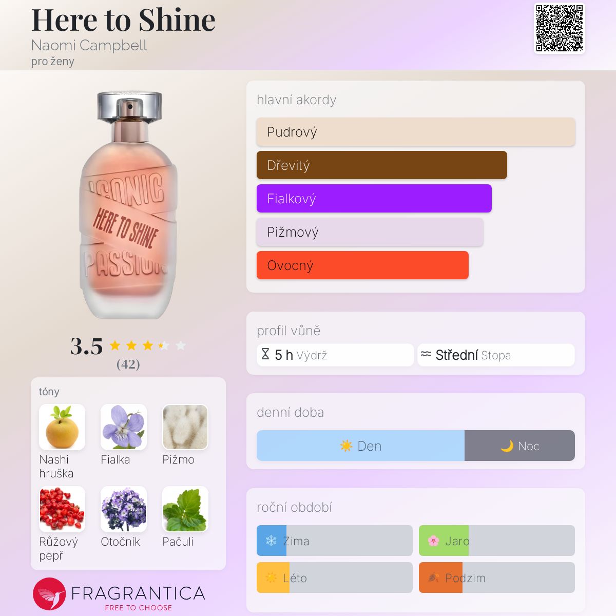 Here to Shine podle Naomi Campbell je Floral vůně pro ženy. Here to Shine byl/a uveden/a v roce 2021. Vrchní tóny jsou Nashi hruška, Růžový pepř a Bergamot; střední tóny jsouFialka, Otočník a Konvalinka ; základní tóny jsou Pižmo, Pačuli, Cedr a Santalové dřevo.