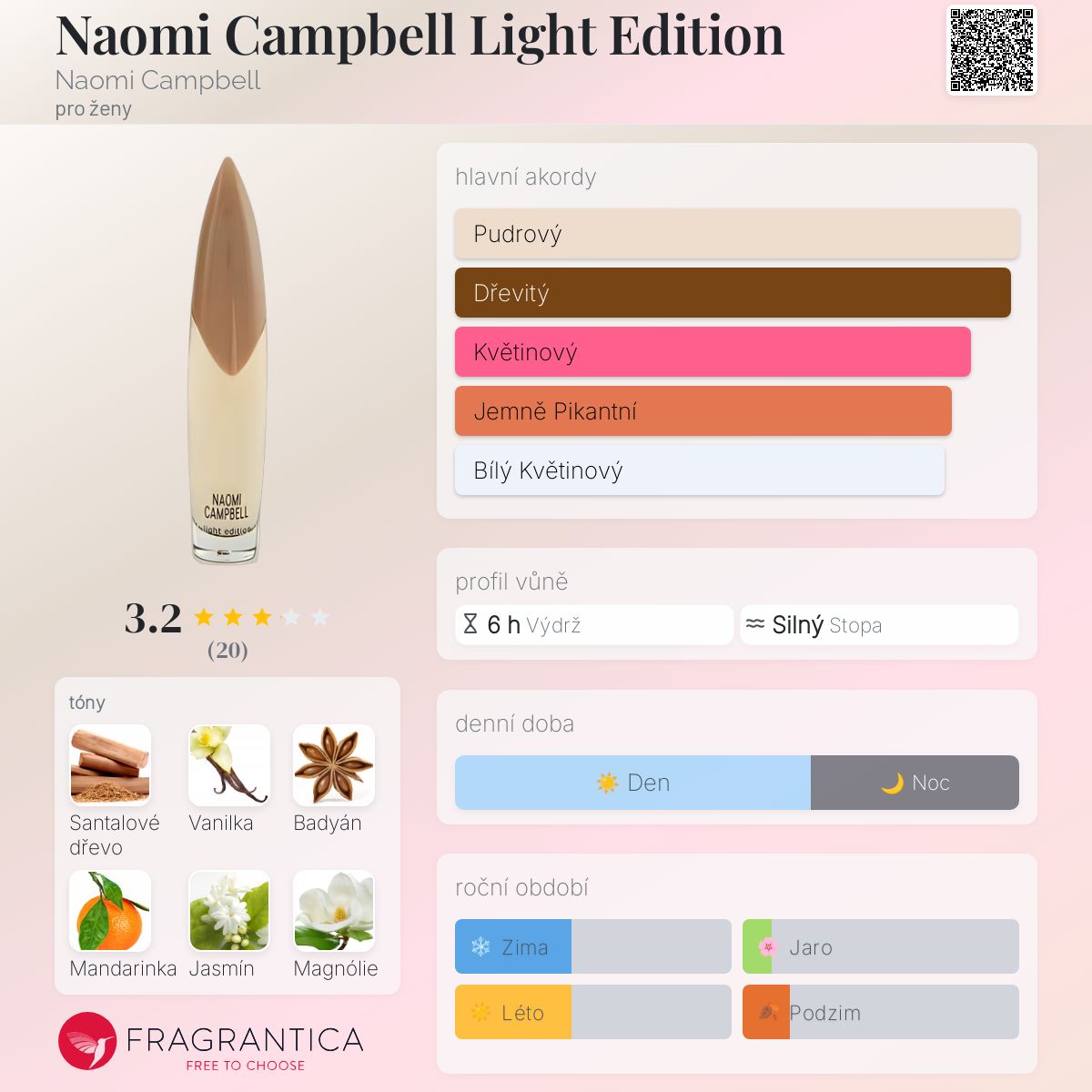 Naomi Campbell Light Edition podle Naomi Campbell je Floral vůně pro ženy. Naomi Campbell Light Edition byl/a uveden/a v roce 2003. Vrchní tóny jsou Badyán, Mandarinka a Meloun; střední tóny jsouJasmín, Magnólie a Noční kvetoucí cereus (kaktus) ; základní tóny jsou Santalové dřevo, Vanilka a Jantar (ambra).