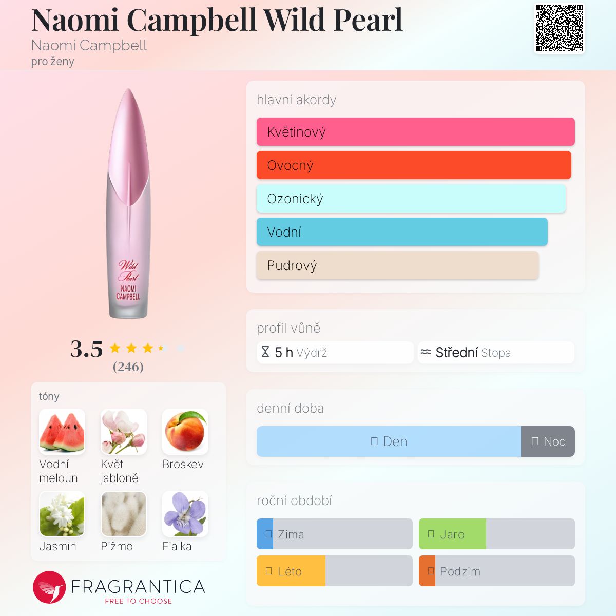 Naomi Campbell Wild Pearl podle Naomi Campbell je Floral Fruity vůně pro ženy. Naomi Campbell Wild Pearl byl/a uveden/a v roce 2011. Vrchní tóny jsou Vodní meloun, Květ jabloně a Broskev; střední tóny jsouJasmín, Fialka a Růžový pepř ; základní tóny jsou Pižmo, Vanilka a Virginský cedr.