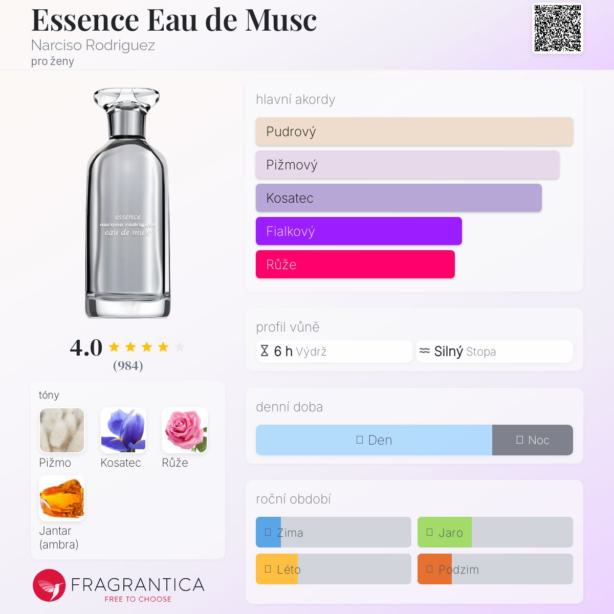 Essence Eau de Musc podle Narciso Rodriguez je Floral vůně pro ženy. Essence Eau de Musc byl/a uveden/a v roce 2011. Vrchní tóny jsou Kosatec a Růže; střední tón jePižmo ; základní tón je Jantar (ambra).