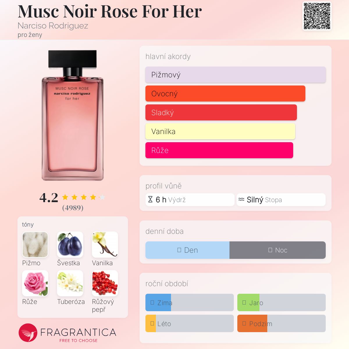 Musc Noir Rose For Her podle Narciso Rodriguez je Orientální Floral vůně pro ženy. Toto je nová vůně. Musc Noir Rose For Her byl/a uveden/a v roce 2022. "Nosem" za touto vůní je Sonia Constant. Vrchní tóny jsou Švestka, Růžový pepř a Bergamot; střední tóny jsouPižmo, Růže a Tuberóza ; základní tón je Vanilka.