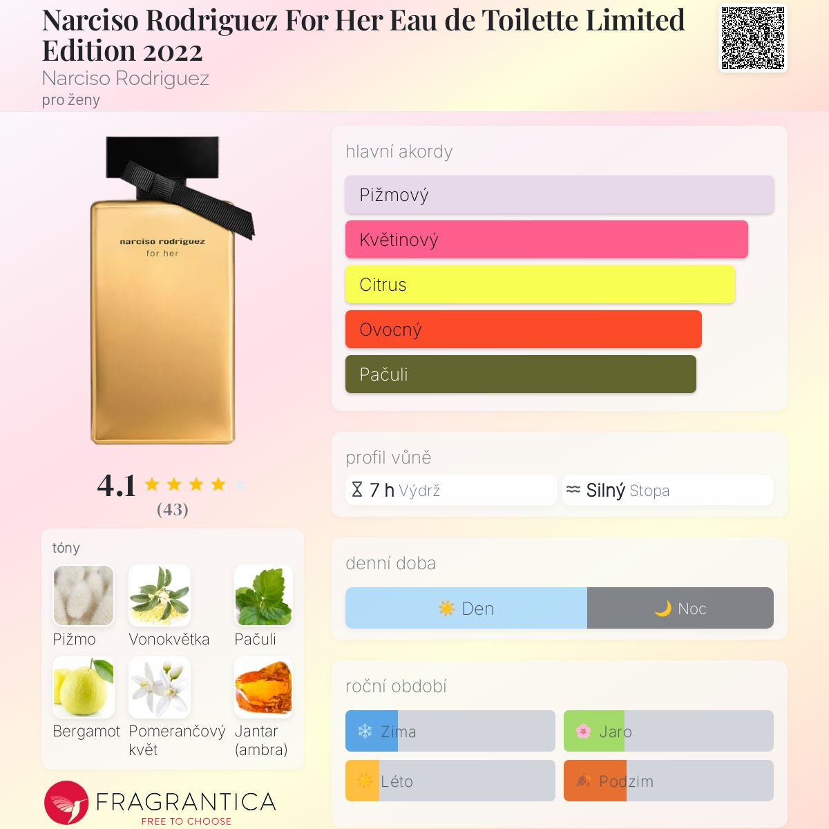 Narciso Rodriguez For Her Eau de Toilette Limited Edition 2022 podle Narciso Rodriguez je vůně pro ženy. Narciso Rodriguez For Her Eau de Toilette Limited Edition 2022 byl/a uveden/a v roce 2022. Narciso Rodriguez For Her Eau de Toilette Limited Edition 2022 byl/a vytvořen/a Christine Nagel a Francis Kurkdjian. Vrchní tóny jsou Vonokvětka, Bergamot a Pomerančový květ; střední tóny jsouPižmo a Jantar (ambra) ; základní tóny jsou Pačuli, Vetiver a Vanilka.