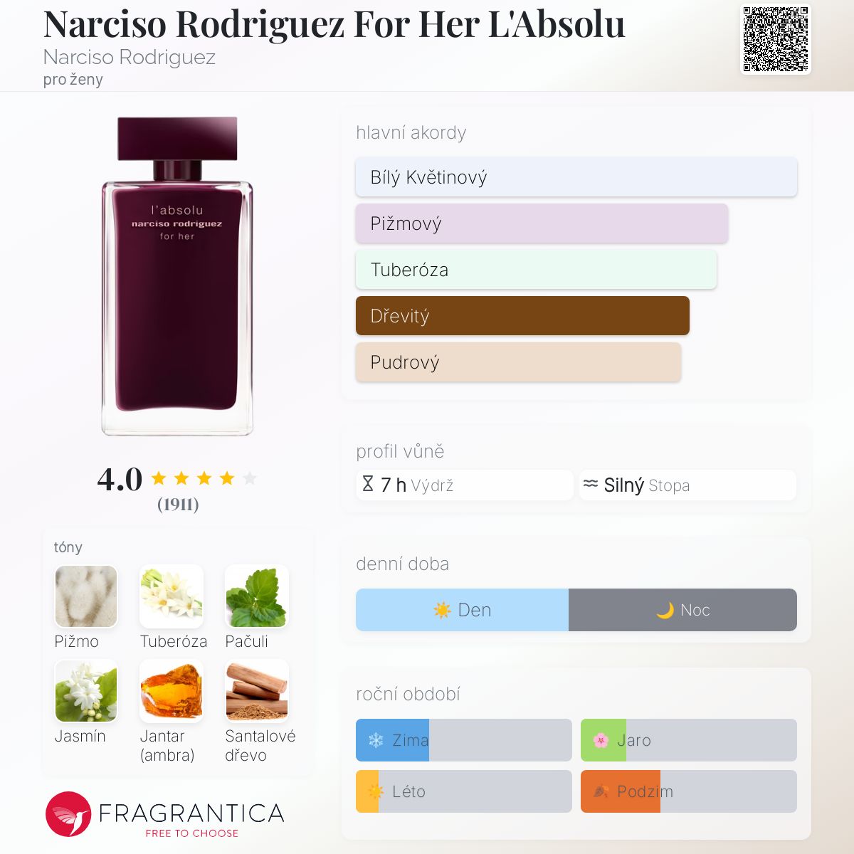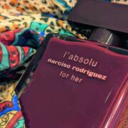 Narciso Rodriguez For Her L'Absolu podle Narciso Rodriguez je Floral Woody Musk vůně pro ženy. Narciso Rodriguez For Her L'Absolu byl/a uveden/a v roce 2015. "Nosem" za touto vůní je Aurélien Guichard. Vrchní tóny jsou Tuberóza a Jasmín; střední tón jePižmo ; základní tóny jsou Pačuli, Jantar (ambra) a Santalové dřevo.