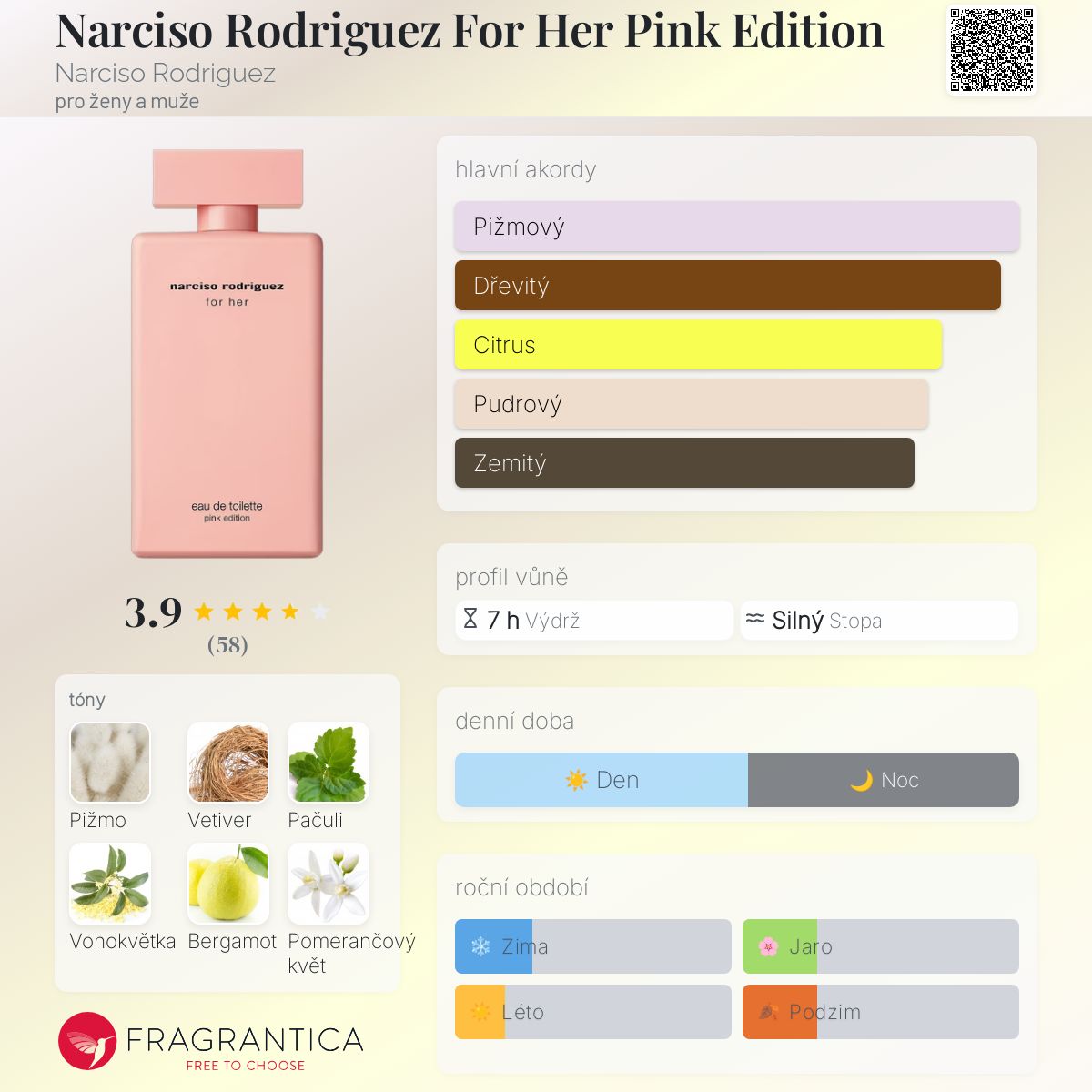 Narciso Rodriguez For Her Pink Edition podle Narciso Rodriguez je Chypre vůně pro ženy a muže. Narciso Rodriguez For Her Pink Edition byl/a uveden/a v roce 2022. Narciso Rodriguez For Her Pink Edition byl/a vytvořen/a Christine Nagel a Francis Kurkdjian. Vrchní tóny jsou Vonokvětka, Bergamot a Pomerančový květ; střední tóny jsouPižmo a Jantar (ambra) ; základní tóny jsou Vetiver, Pačuli a Vanilka.