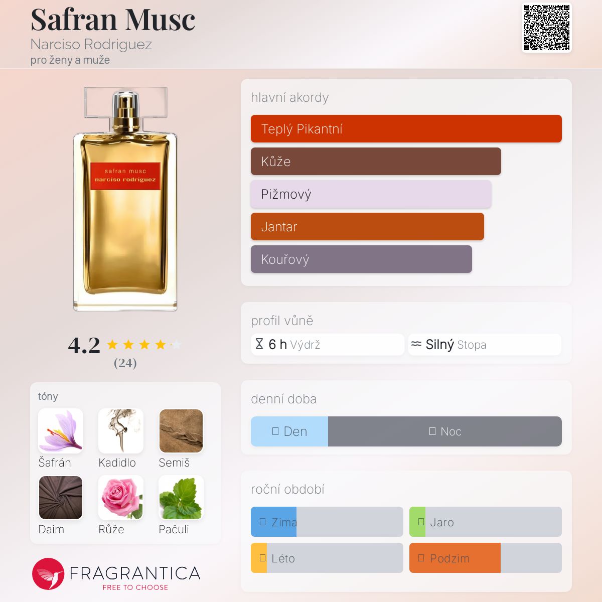 Safran Musc podle Narciso Rodriguez je Orientální Floral vůně pro ženy a muže. Toto je nová vůně. Safran Musc byl/a uveden/a v roce 2025. Vrchní tóny jsou Šafrán, Damašská růže a Pomerančový květ; střední tóny jsouDaim a Pižmo ; základní tóny jsou Kadidlo, Semiš, Pačuli a Cypriolový olej.