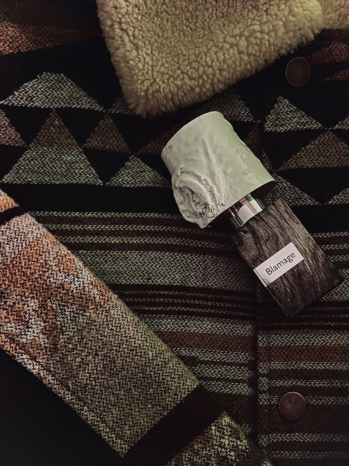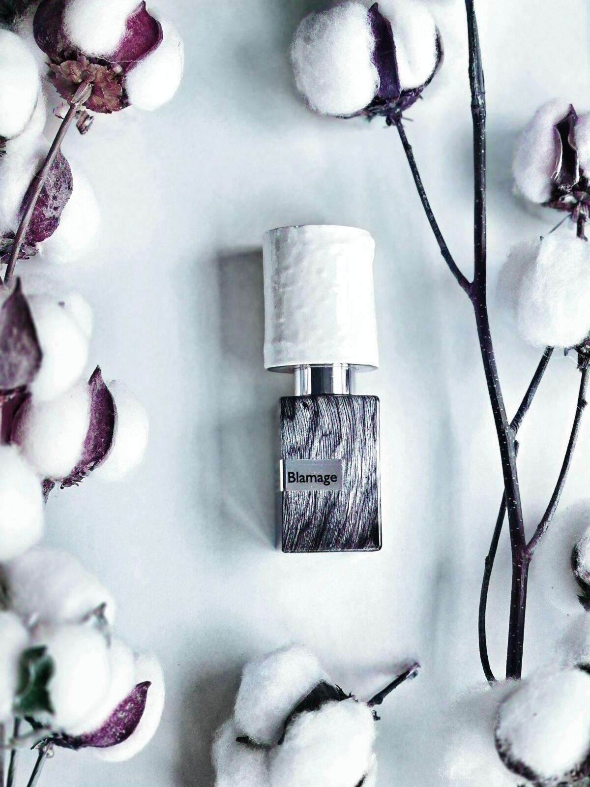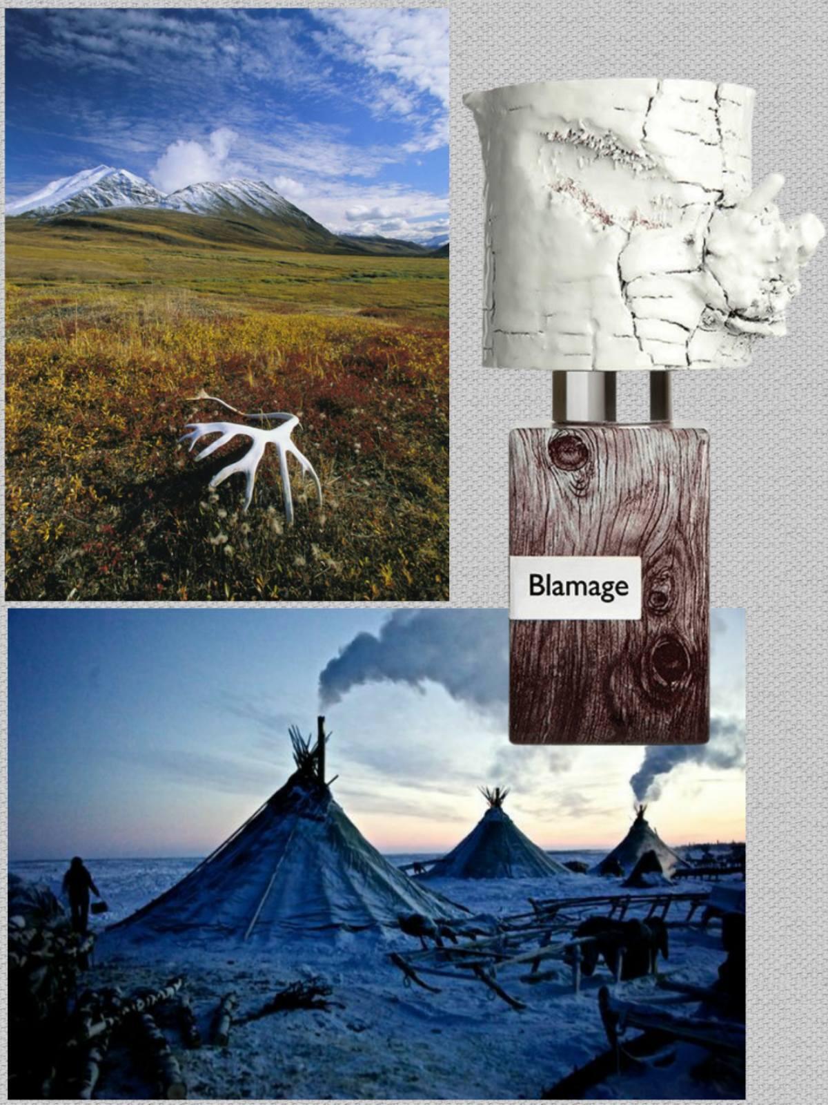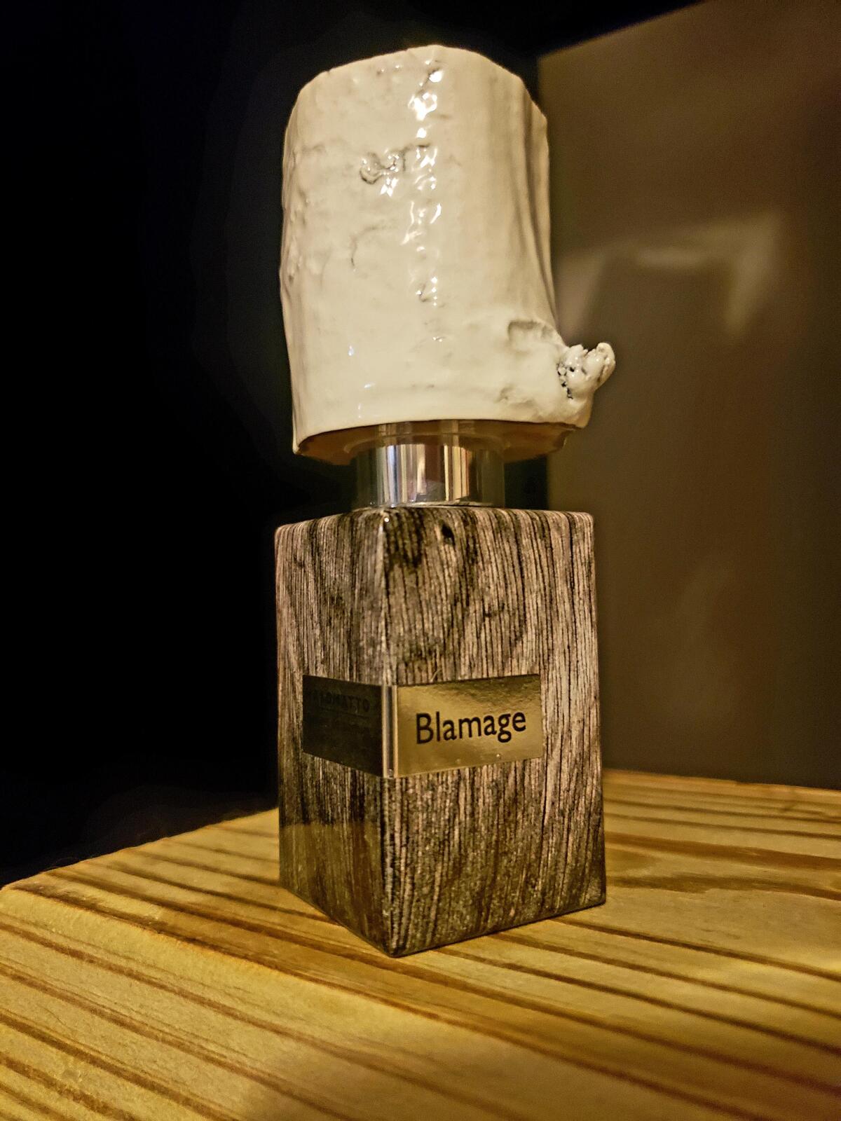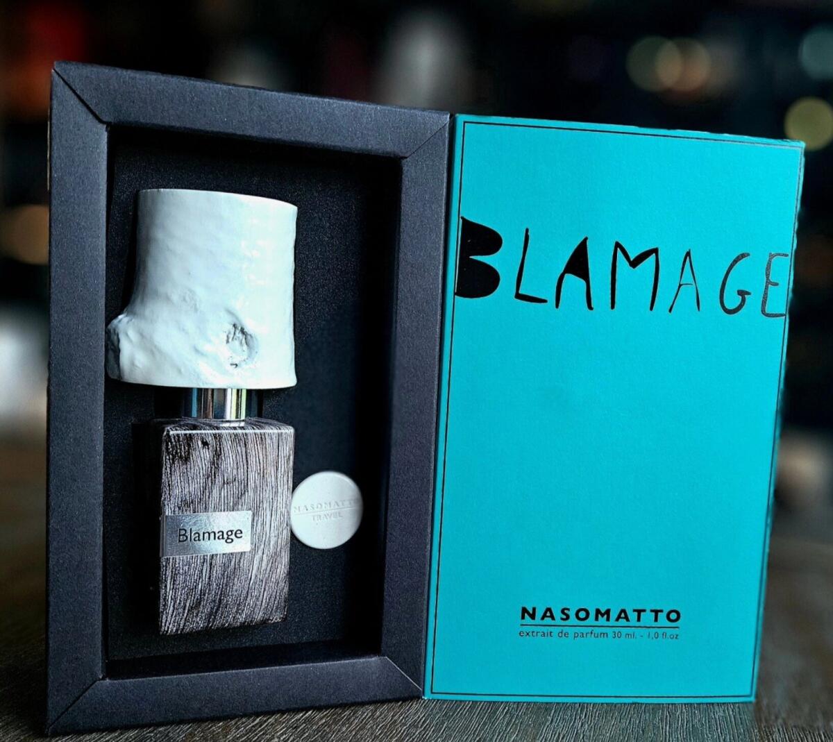 Nasomatto Blamage je věrná svým tónům, vůně se otevírá kombinací měkké kůže, pižma a živočišných akordů; bílá dřeva jsou jemná a aromatická. Kombinace pižma a břízy vytváří živočišný, velmi rafinovaný, čistý potní tón. Akord bílých dřev je aromatický, čerstvě nasekané dřevo. Jak vůně zasychá, živočišný akord se zjemňuje a rozvíjí pudrový akord, který téměř eliminuje svou původní živočišnou povahu a zanechává velmi rafinovaný a pudrový pižmový tón. Výraznost úvodní vůně je středně vysoká; výraznost zasychající vůně je střední. Jakmile Nasomatto Blamage dosáhne úplného zaschnutí, lze ji shrnout jako středně silnou projekci mírně pudrové rafinované pižmové vůně s jemnými dřevitými a koženými akordy. Vůně působí živočišně, noblesně, elegantně, exoticky, vyzrále, vzácně, rafinovaně, unisexově a poněkud příjemně.