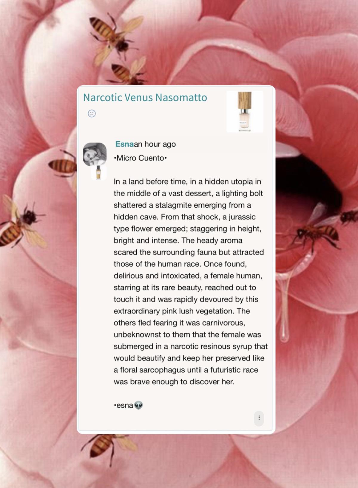 Jestli je v mé sbírce nějaký něžný parfém, je to bezpochyby Narcotic Venus, když jsem se na něj poprvé nastříkala, cítila jsem takovou sladkou, květinovou vůni, jako svatební kytice bílých květů, cítila jsem se hřejivě a něžně; koupila jsem si ho, protože jsem byla v předvečer své svatby a hledala jsem tu zvláštní vůni; jaké překvapení, že jsem si ji zamilovala! Cítíte perfektní jasmín a tuberózu, nejskutečnější, přírodní tuberózu a jasmín, který máma vchází do domu, bezpochyby krása nejlepší kompliment můj manžel u oltáře, když jsme poslouchali otec mi řekl, jak hezky voní květiny z vaší kytice a já; ne láska to není kytice to je můj parfém! 🙃 a on to miloval.