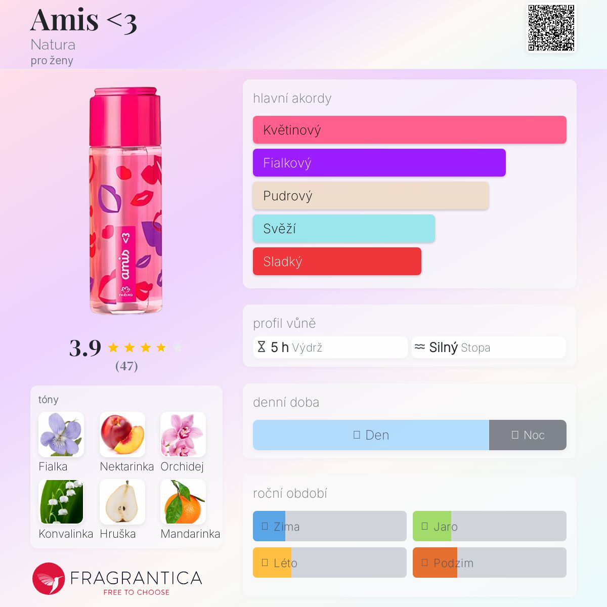 Amis <3 podle Natura je Floral vůně pro ženy. Amis <3 byl/a uveden/a v roce 2015. Amis <3 byl/a vytvořen/a Verônica Kato, Christelle Laprade a Honorine Blanc. Vrchní tóny jsou Nektarinka, Hruška a Mandarinka; střední tóny jsouFialka, Orchidej a Konvalinka ; základní tóny jsou Pižmo, Santalové dřevo a Cedr.