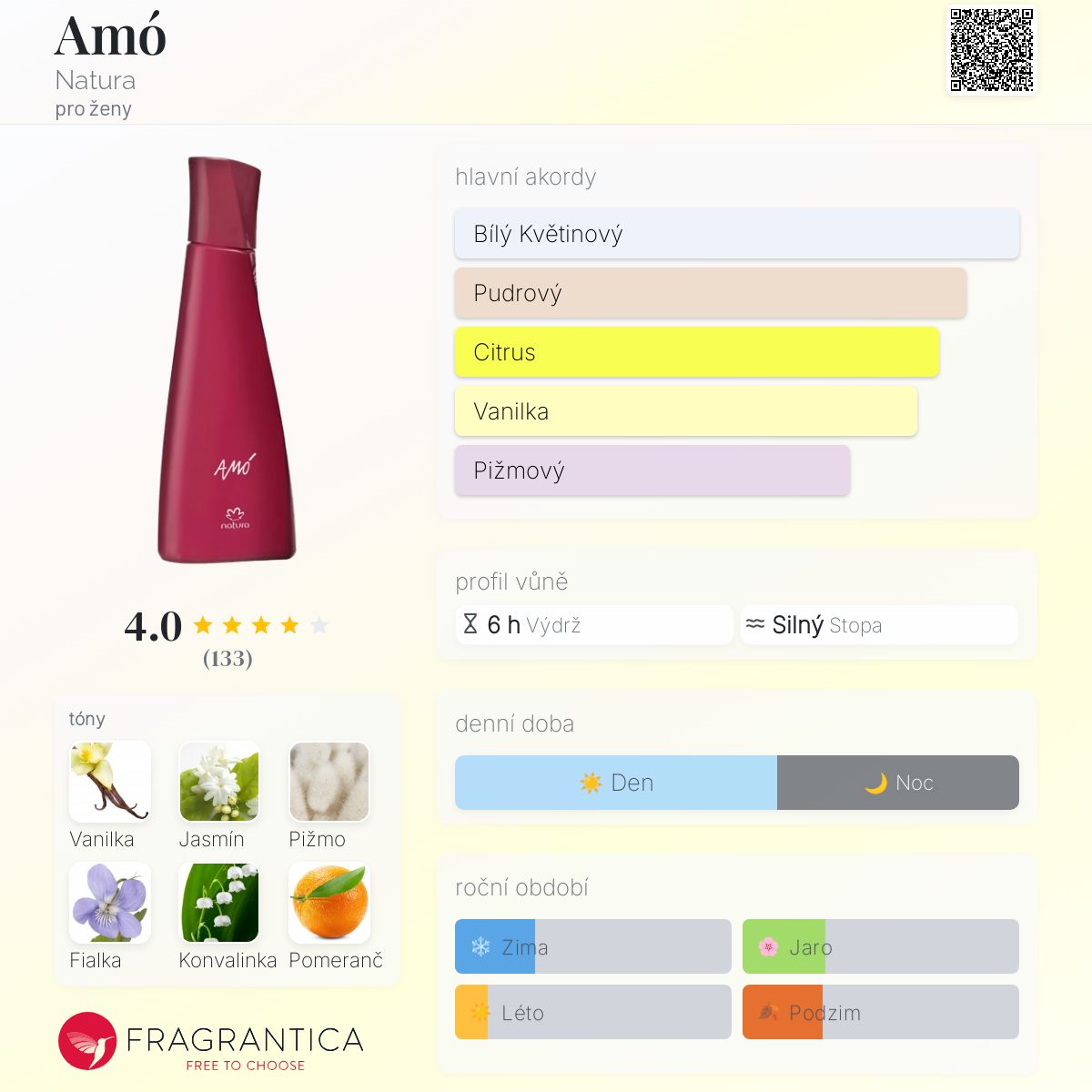 Amó podle Natura je Floral Woody Musk vůně pro ženy. Amó byl/a uveden/a v roce 2015. "Nosem" za touto vůní je Verônica Kato. Vrchní tóny jsou Pomeranč, Bergamot a Citrón; střední tóny jsouJasmín, Fialka a Konvalinka ; základní tóny jsou Vanilka, Pižmo a Cedr.