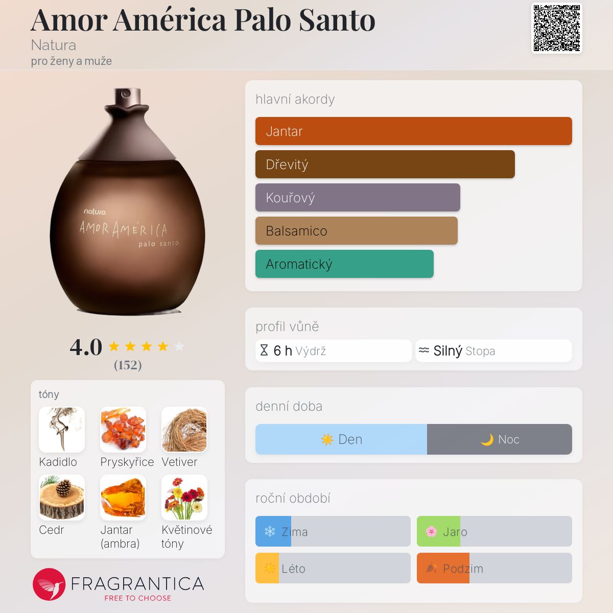 Amor América Palo Santo podle Natura je Floral vůně pro ženy a muže. Amor América Palo Santo byl/a uveden/a v roce 2008. "Nosem" za touto vůní je Verônica Kato.