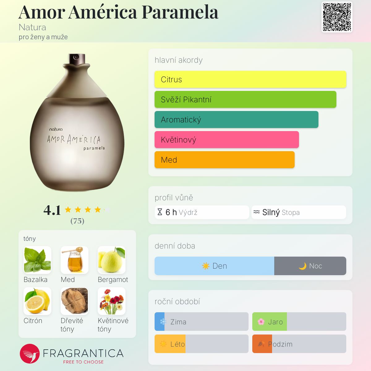 Amor América Paramela podle Natura je Floral vůně pro ženy a muže. Amor América Paramela byl/a uveden/a v roce 2008. "Nosem" za touto vůní je Verônica Kato. Vrchní tóny jsou Bazalka, Bergamot a Citron amalfi; střední tón jeKvětinové tóny ; základní tóny jsou Med a Dřevité tóny.