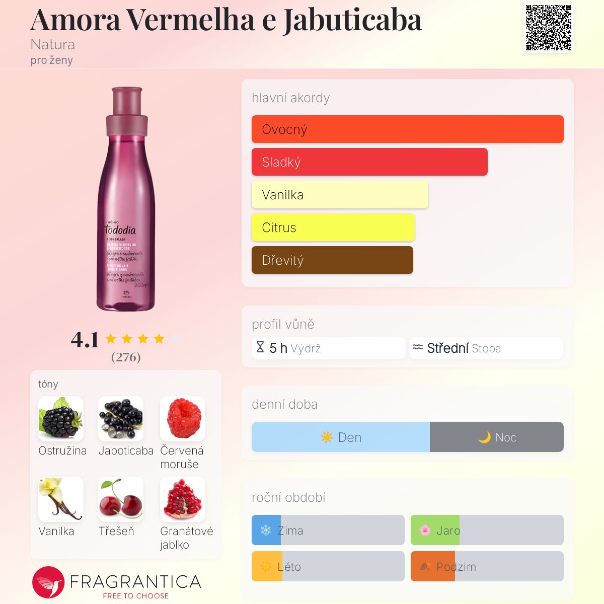 Amora Vermelha e Jabuticaba podle Natura je Floral Fruity vůně pro ženy. Amora Vermelha e Jabuticaba byl/a uveden/a v roce 2020. "Nosem" za touto vůní je Verônica Kato. Vrchní tóny jsou Červená moruše, Třešeň, Granátové jablko, Liči, Hruška, Brazilská mandarinka a Pomeranč; střední tóny jsouOstružina, Jaboticaba, Švestka, Magnólie, Falešný jasmín a Konvalinka ; základní tóny jsou Vanilka, Pižmo, Karamel, Jantar (ambra), Fazole tonka a Santalové dřevo.
