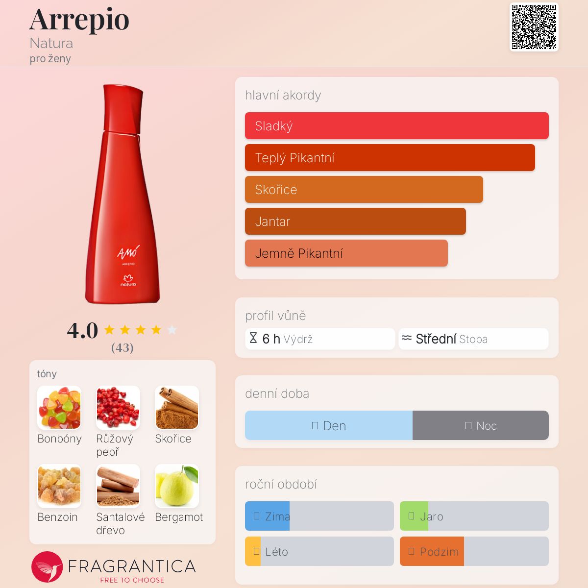 Arrepio podle Natura je Woody Spicy vůně pro ženy. Arrepio byl/a uveden/a v roce 2015. "Nosem" za touto vůní je Verônica Kato. Vrchní tóny jsou Bergamot, Růže, Ovocné tóny, Konvalinka a Vodnaté tóny; střední tóny jsouRůžový pepř a Skořice ; základní tóny jsou Sladké tóny, Benzoin a Santalové dřevo.