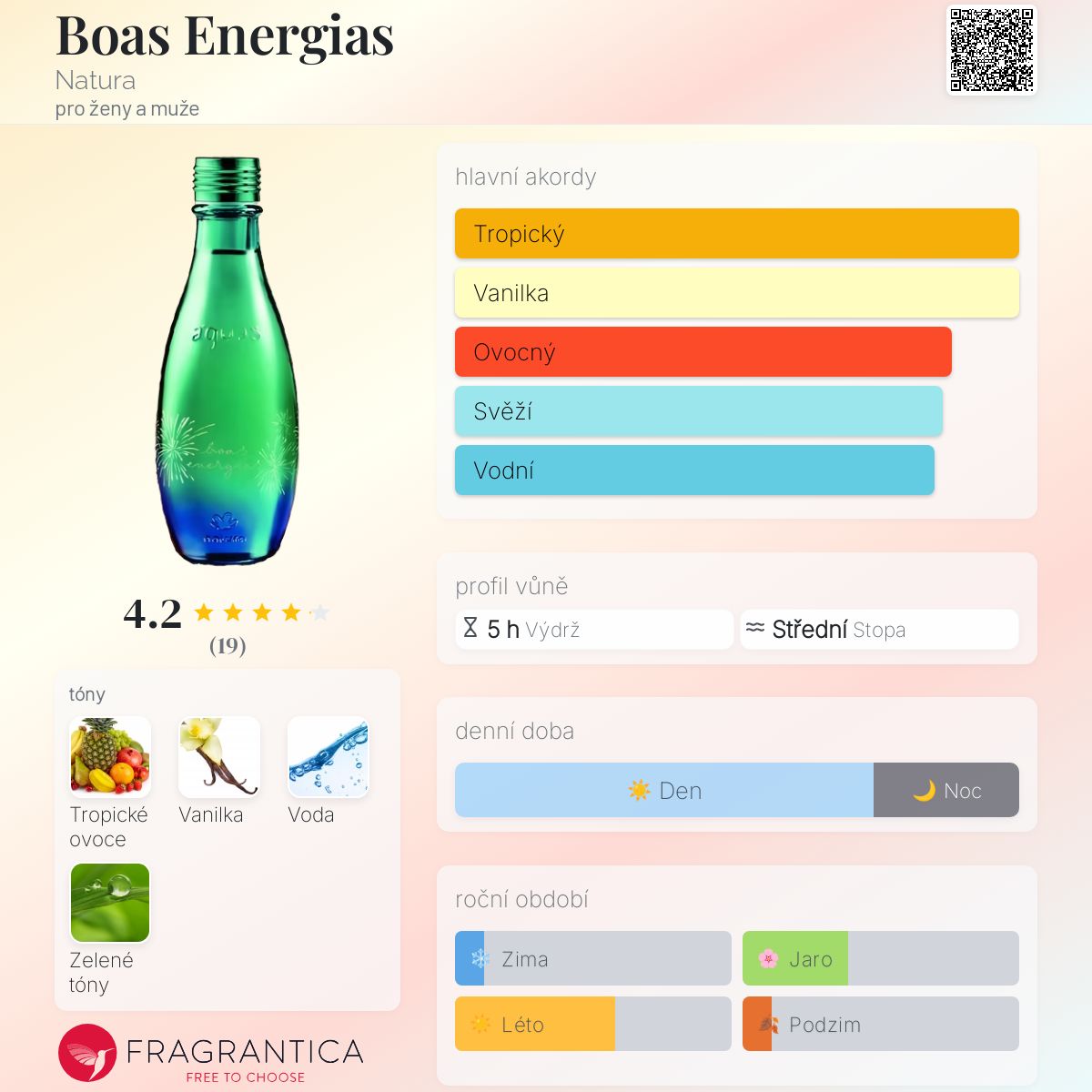 Boas Energias podle Natura je Aromatic Aquatic vůně pro ženy a muže. Boas Energias byl/a uveden/a v roce 2018. "Nosem" za touto vůní je Verônica Kato. Vrchní tóny jsou Tropické ovoce a Bylinné tóny; střední tón jeVodnaté tóny ; základní tón je Vanilka.
