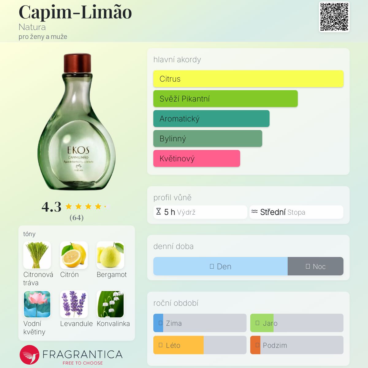 Capim-Limão podle Natura je Citrus vůně pro ženy a muže. Capim-Limão byl/a uveden/a v roce 2009. "Nosem" za touto vůní je Verônica Kato. Vrchní tóny jsou Citronová tráva, Citrón a Bergamot; střední tóny jsouVodní květiny, Levandule a Konvalinka ; základní tóny jsou Pižmo, Santalové dřevo, Cedr a Jantar (ambra).