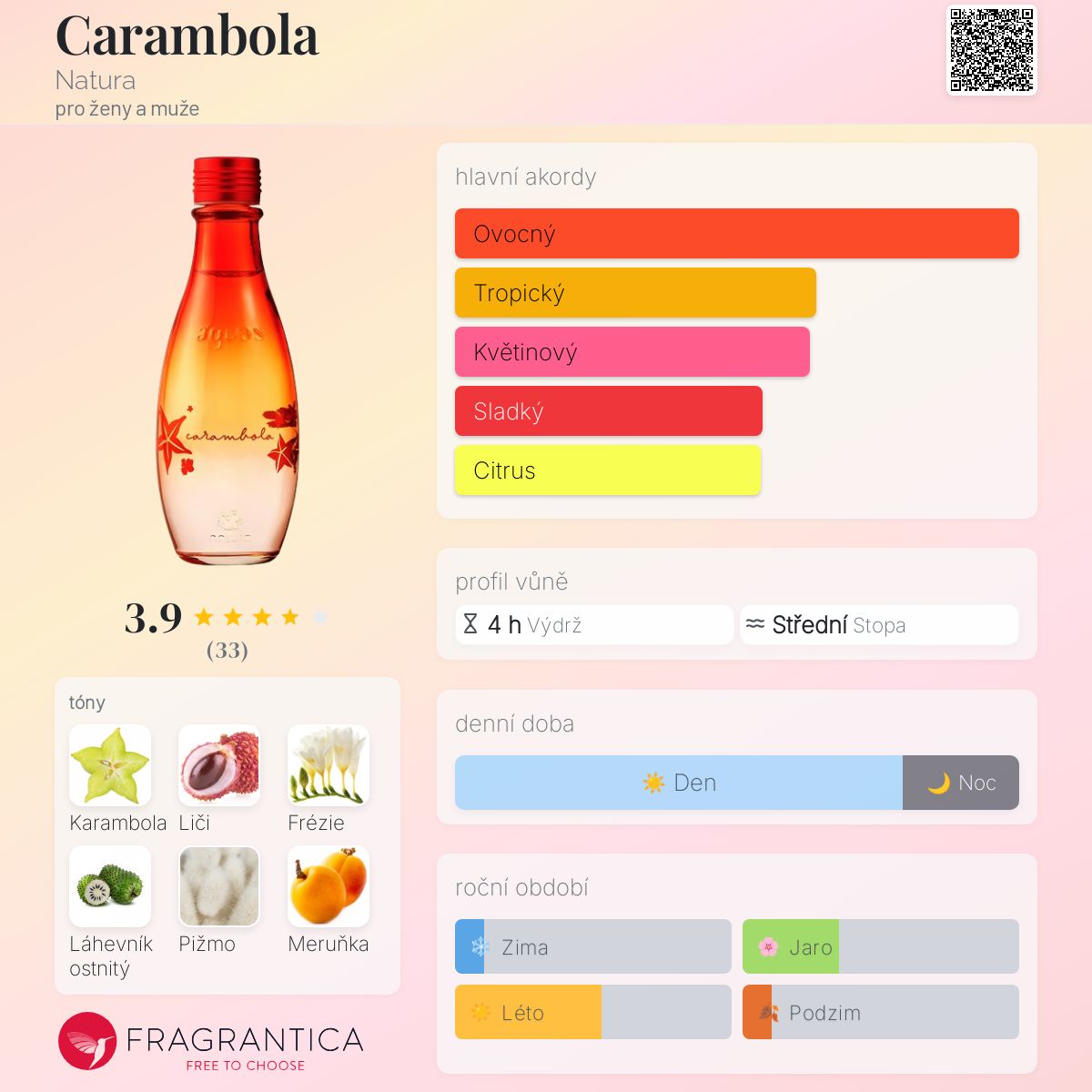 Carambola podle Natura je Floral vůně pro ženy a muže. Carambola byl/a uveden/a v roce 2019. "Nosem" za touto vůní je Verônica Kato. Vrchní tóny jsou Karambola, Liči, Meruňka, Mandarinka, Borůvky a Ostružina; střední tóny jsouFrézie, Láhevník ostnitý, Lotus a Magnólie ; základní tóny jsou Pižmo, Jantarové dřevo, Santalové dřevo a Vanilka.