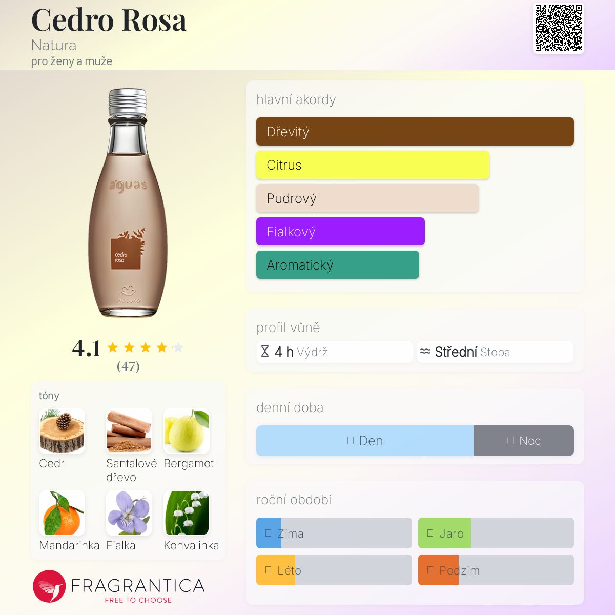 Cedro Rosa podle Natura je Floral Woody Musk vůně pro ženy a muže. Cedro Rosa byl/a uveden/a v roce 2011. Vrchní tóny jsou Bergamot a Mandarinka; střední tóny jsouFialka a Konvalinka ; základní tóny jsou Cedr a Santalové dřevo.