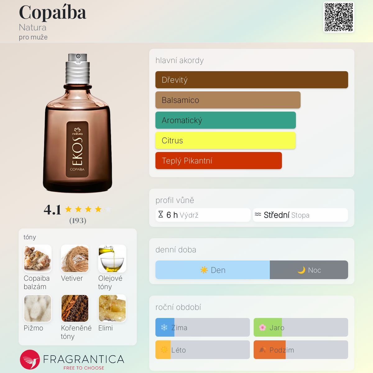 Copaíba podle Natura je Woody Aromatic vůně pro muže. Copaíba byl/a uveden/a v roce 2015. "Nosem" za touto vůní je Verônica Kato. Vrchní tóny jsou Kořeněné tóny, Pryskyřice elimi, Methyl grapefruit, Bergamot, Mandarinka klementina a Citrón; střední tóny jsouJava vetiverový olej a Atlasový cedr ; základní tóny jsou Copaiba balzám, Vetiver, Olejové tóny, Pižmo, Santalové dřevo, Kůže a Labdanum.