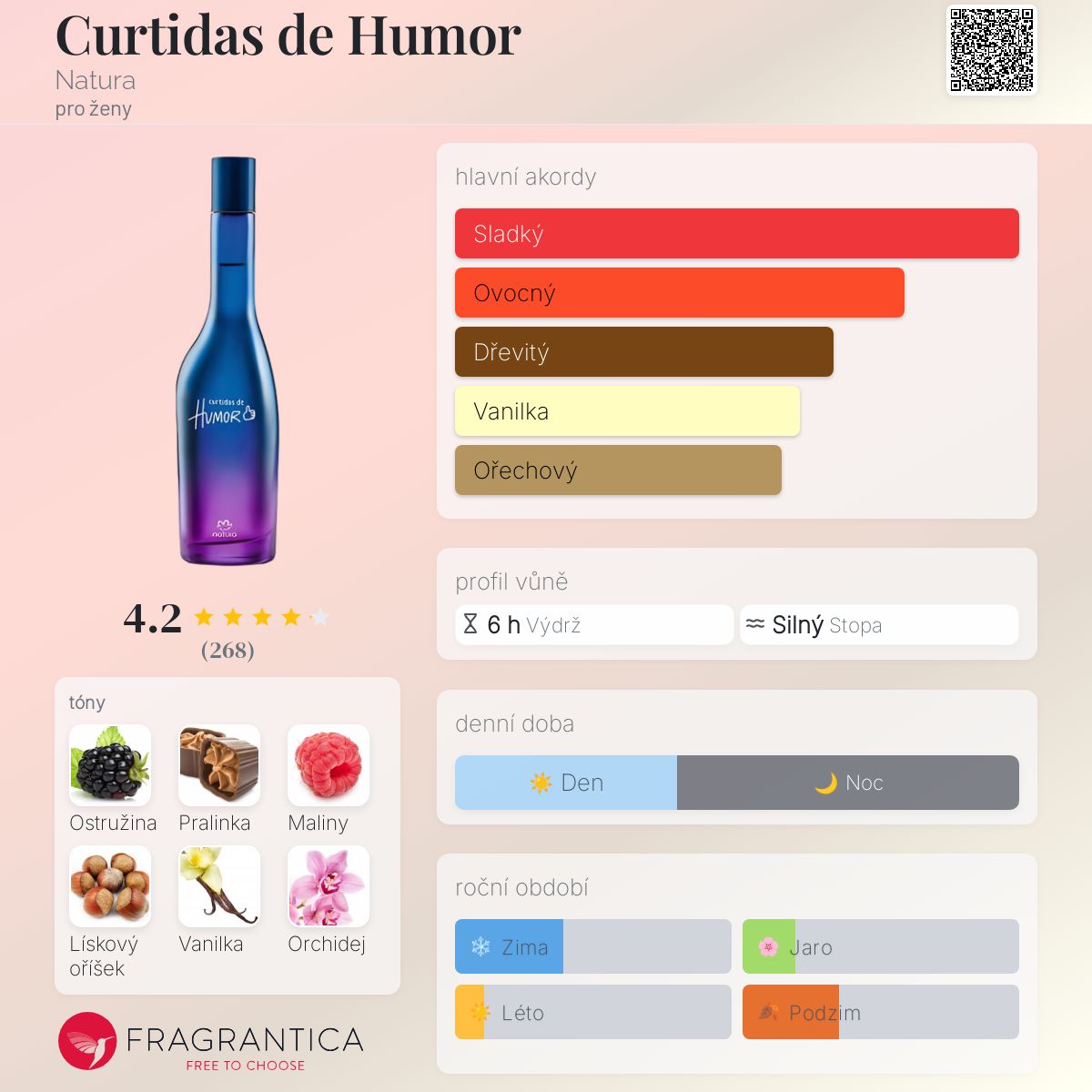 Curtidas de Humor podle Natura je Floral Fruity Gourmand vůně pro ženy. Curtidas de Humor byl/a uveden/a v roce 2018. Curtidas de Humor byl/a vytvořen/a Alienor Massenet a Verônica Kato. Vrchní tóny jsou Ostružina, Maliny, Růžový pepř a Mandarinka; střední tóny jsouLískový oříšek, Černá orchidej, Otočník, Frézie a Jasmín ; základní tóny jsou Pralinka, Vanilka, Kumarin, Maltol, Jantarové dřevo, Santalové dřevo, Pačuli, Cedr a Pižmo.