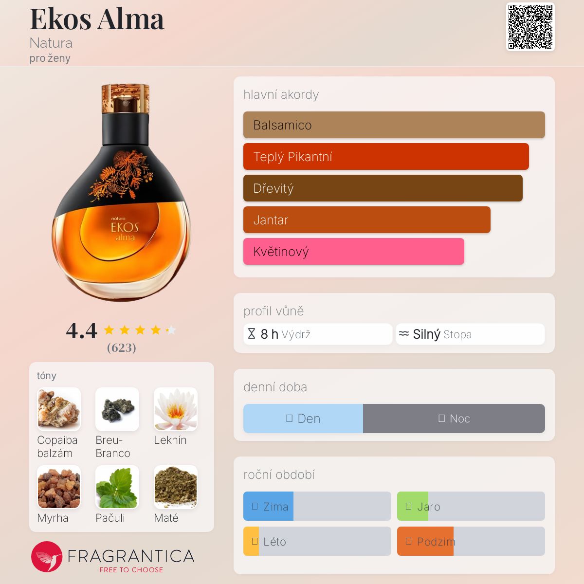 Ekos Alma podle Natura je Floral vůně pro ženy. Ekos Alma byl/a uveden/a v roce 2019. Ekos Alma byl/a vytvořen/a Verônica Kato a Yves Cassar. Vrchní tóny jsou Maté, Růžový pepř, Černý pepř, Kardamom a Bergamot; střední tóny jsouLeknín, Magnólie, Růže, Fialka, Vonokvětka a Jasmín ; základní tóny jsou Copaiba balzám, Breu-Branco, Myrha, Pačuli, Benzoin, Olibanum, Vetiver, Labdanum, Kumarin, Vanilka a Mrkev.