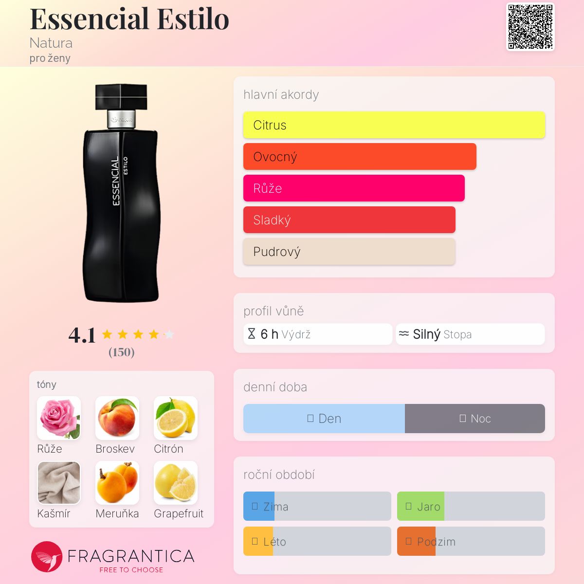 Essencial Estilo podle Natura je Floral vůně pro ženy. Essencial Estilo byl/a uveden/a v roce 2015. "Nosem" za touto vůní je Verônica Kato. Vrchní tóny jsou Broskev, Italský citrón, Meruňka, Grapefruit, Italská mandarinka, Pomeranč, Zelené jablko a Maliny; střední tóny jsouTurecká růže, Pomerančový květ, Konvalinka, Pivoňka, Magnólie a Jasmín Sambac ; základní tóny jsou Kašmír, Pižmo, Pralinka, Vanilka, Santalové dřevo, Jantar (ambra) a Pačuli.