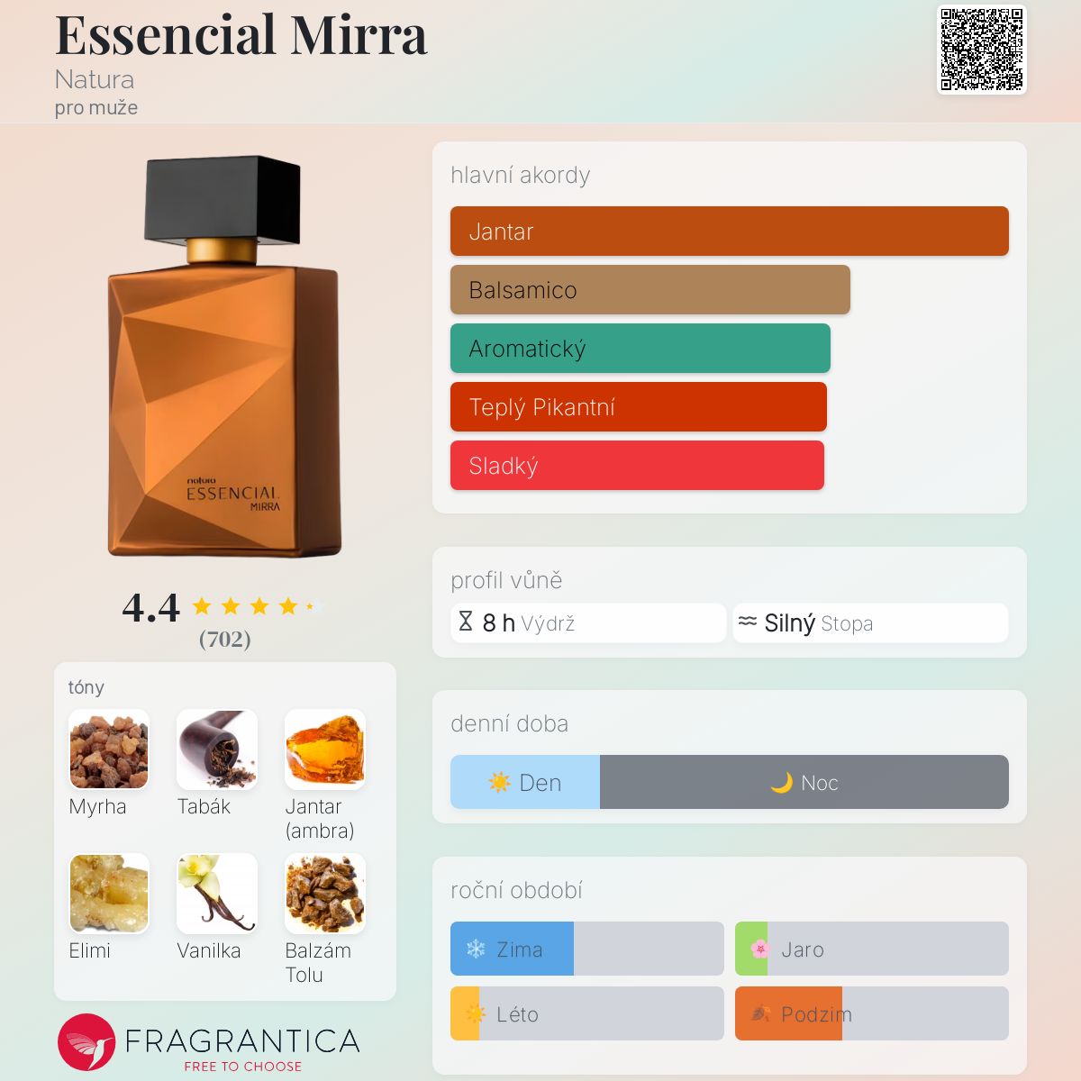 Essencial Mirra podle Natura je Orientální vůně pro muže. Essencial Mirra byl/a uveden/a v roce 2020. "Nosem" za touto vůní je Verônica Kato. Vrchní tóny jsou Elimi, Černý pepř, Kardamom, Bergamot, Koriandr a Citrón; střední tóny jsouMrkev, Pšenice, Švestka a Davana ; základní tóny jsou Myrha, Tabák, Jantar (ambra), Vanilka, Balzám Tolu, Fazole tonka, Peruánský balzám, Kašmír, Pačuli a Labdanum.