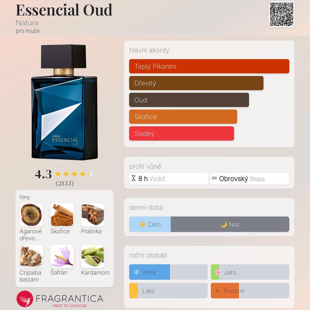 Essencial Oud podle Natura je Woody vůně pro muže. Essencial Oud byl/a uveden/a v roce 2017. Essencial Oud byl/a vytvořen/a Verônica Kato a Pierre-Constantin Guéros. Vrchní tóny jsou Šafrán, Kardamom, Bergamot a Elemi; střední tóny jsouSkořice, Pralinka, Pelargónie, Cypriolový olej a Gurjanský balzám ; základní tóny jsou Agarové dřevo (oud), Copaiba balzám, Santalové dřevo, Pačuli, Cedr, Jantar (ambra), Pižmo, Kašmír, Ambrocenide a Jedle.
