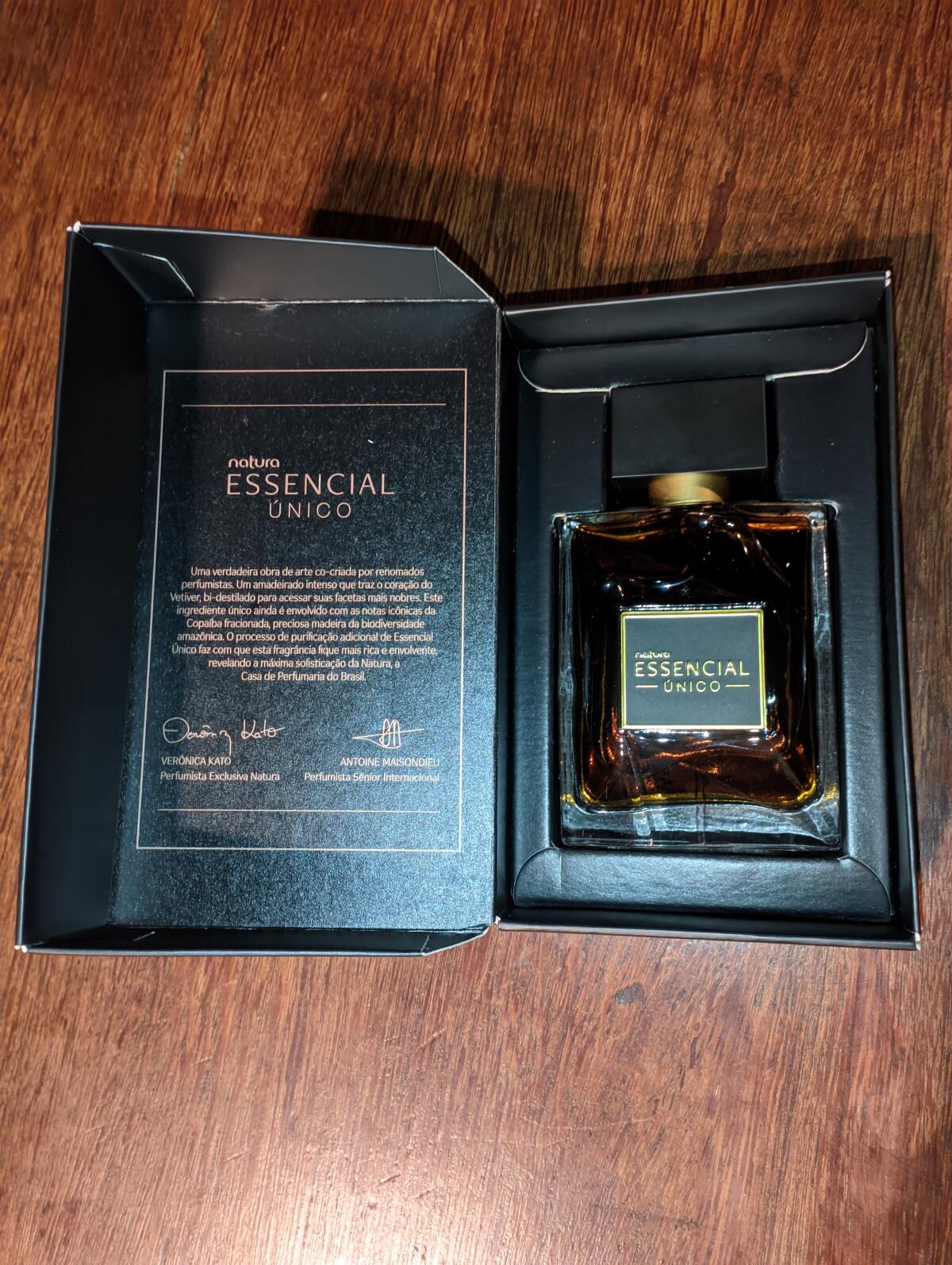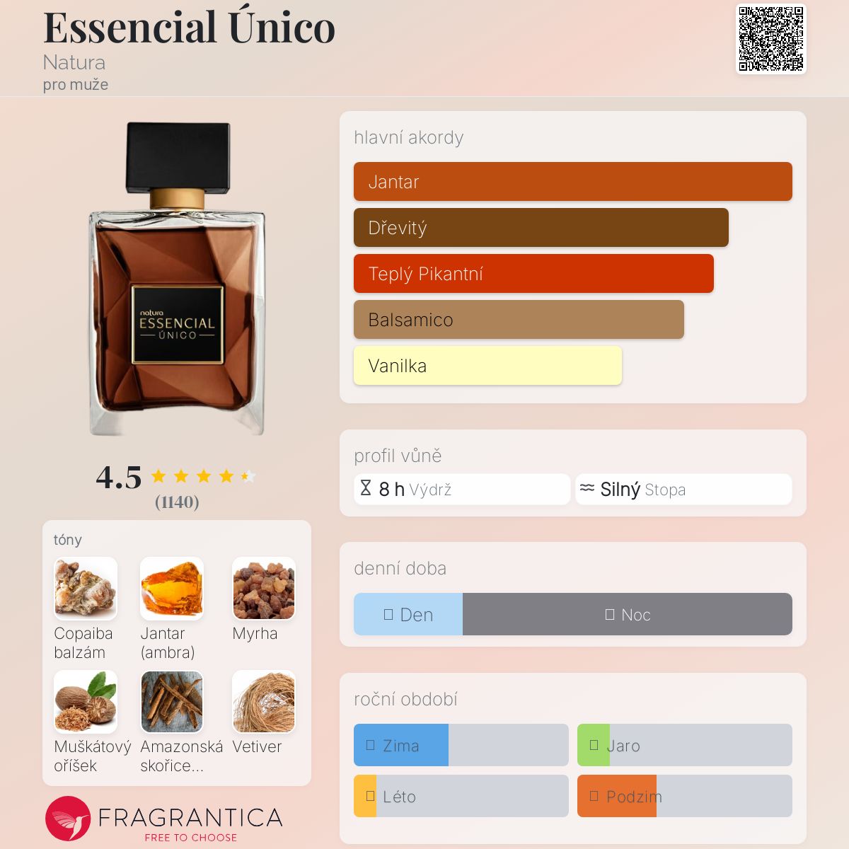 Essencial Único podle Natura je Woody vůně pro muže. Essencial Único byl/a uveden/a v roce 2022. Essencial Único byl/a vytvořen/a Verônica Kato a Antoine Maisondieu. Vrchní tóny jsou Muškátový oříšek, Amazonská skořice mletá, Šafrán, Růžový pepř a Pomelo; střední tóny jsouCopaiba balzám, Vetiver, Cedr a Frézie ; základní tóny jsou Jantar (ambra), Myrha, Vanilka, Benzoin, Kumarin, Labdanum, Opoponax a Pižmo.