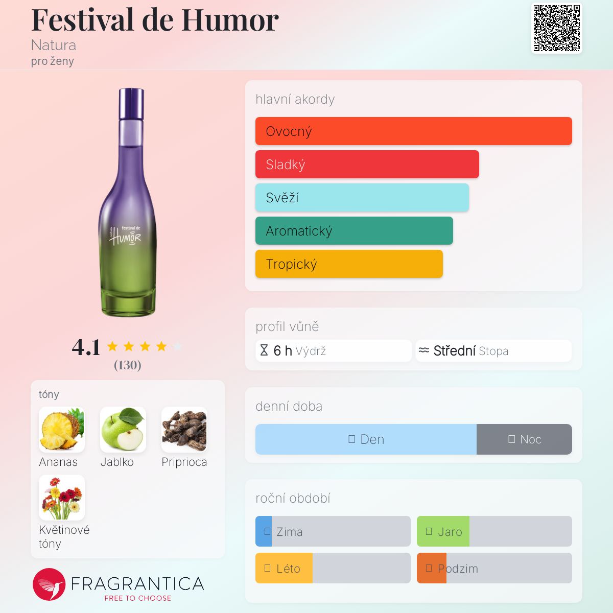 Festival de Humor podle Natura je Floral Fruity vůně pro ženy. Toto je nová vůně. Festival de Humor byl/a uveden/a v roce 2024. "Nosem" za touto vůní je Verônica Kato. Vrchní tóny jsou Ananas a Zelené jablko; střední tón jeKvětiny ; základní tón je Priprioca.