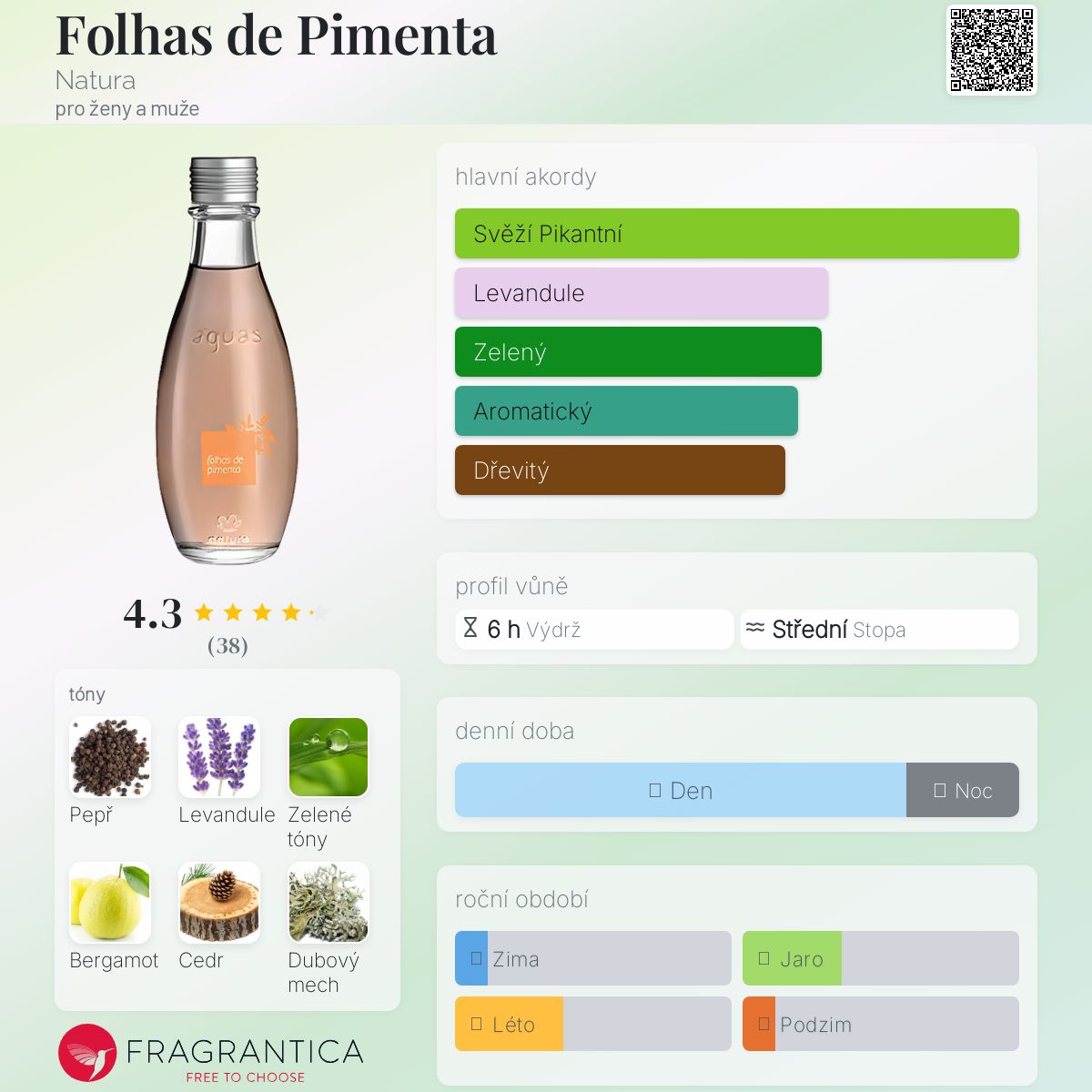 Folhas de Pimenta podle Natura je Woody Aromatic vůně pro ženy a muže. Folhas de Pimenta byl/a uveden/a v roce 2008. Vrchní tóny jsou Černý pepř, Zelené tóny a Bergamot; střední tóny jsouČerný pepř a Levandule ; základní tóny jsou Cedr, Dubový mech a Jantar (ambra).